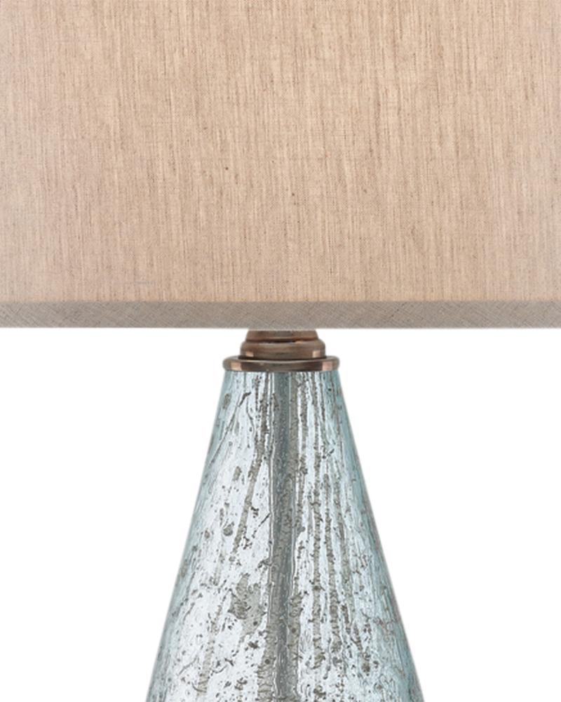 The Optimist Table Lamp has pale blue tones running through its speckled glass. Sitting atop an optic crystal base, the light blue lamp is topped with a natural linen shade that brings added elemental style to the glass lamp.
