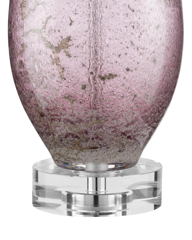 The Optimist Purple Table Lamp is made of muted lavender mouth-blown glass with speckled artisanal patterns running along its surface, the stippling a mark of true artistry that illustrates the handmade aspect of this work of art. Sitting atop an optic crystal base, the pale purple body is topped with an off-white linen shade that brings added elemental style to the glass lamp. The hardware and finial in an antique nickel finish are also warm elements.