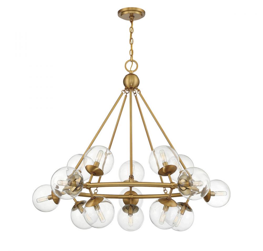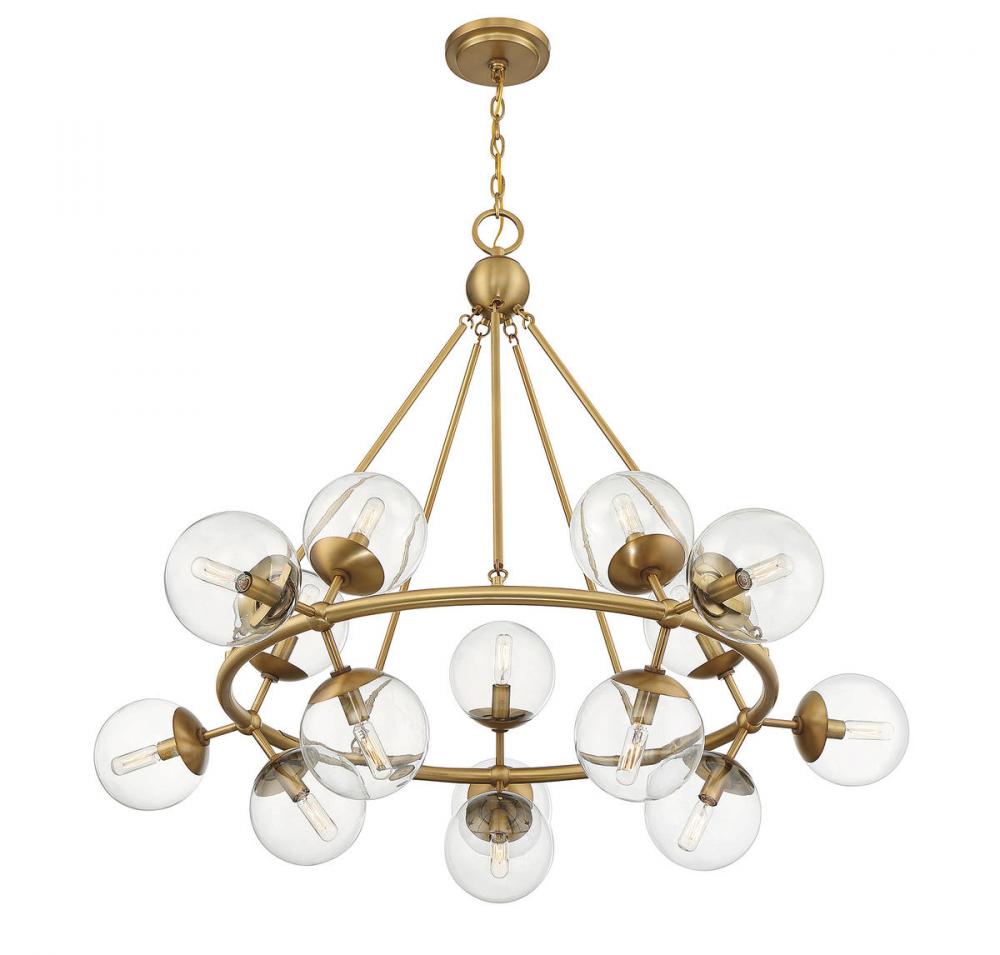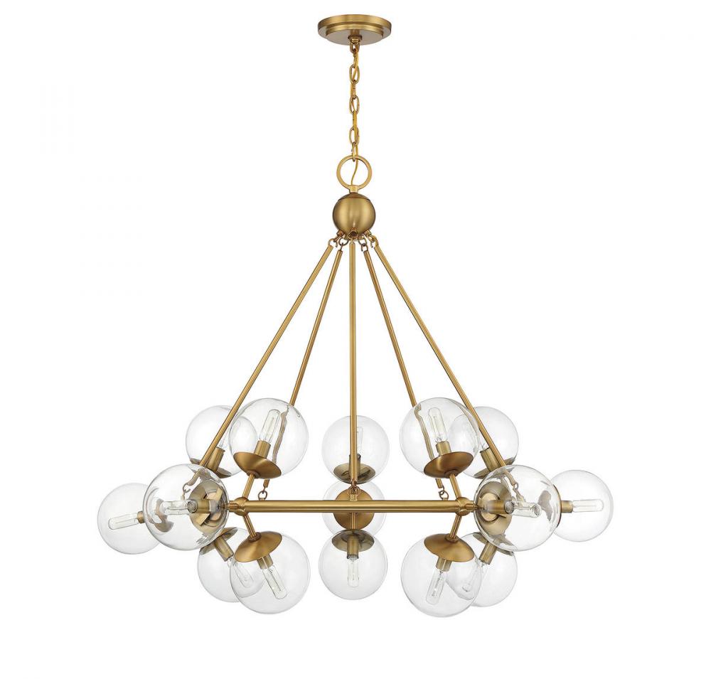 Big in size and boldly bubbly, the wow-worthy Savoy House Orion 15-light chandelier showcases a multitude of clear glass orbs on a circular structure that is finished in warm brass. It is sure to steal the show in any space. It is 37" in height and 45" in width. Uses fifteen standard size bulbs of up to 60 watts per bulb. Comes with 120" of chain and 144" of cord.