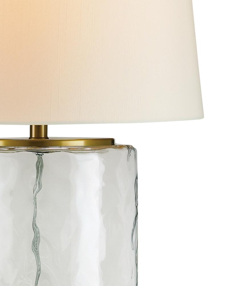 The elegant drum-like body of the Oscar Table Lamp is luminous in a watery glass that feels similar to the surface of an antique windowpane. The polished brass hardware and finial bring warmth to the clear glass lamp, which is topped with an off-white shantung shade.