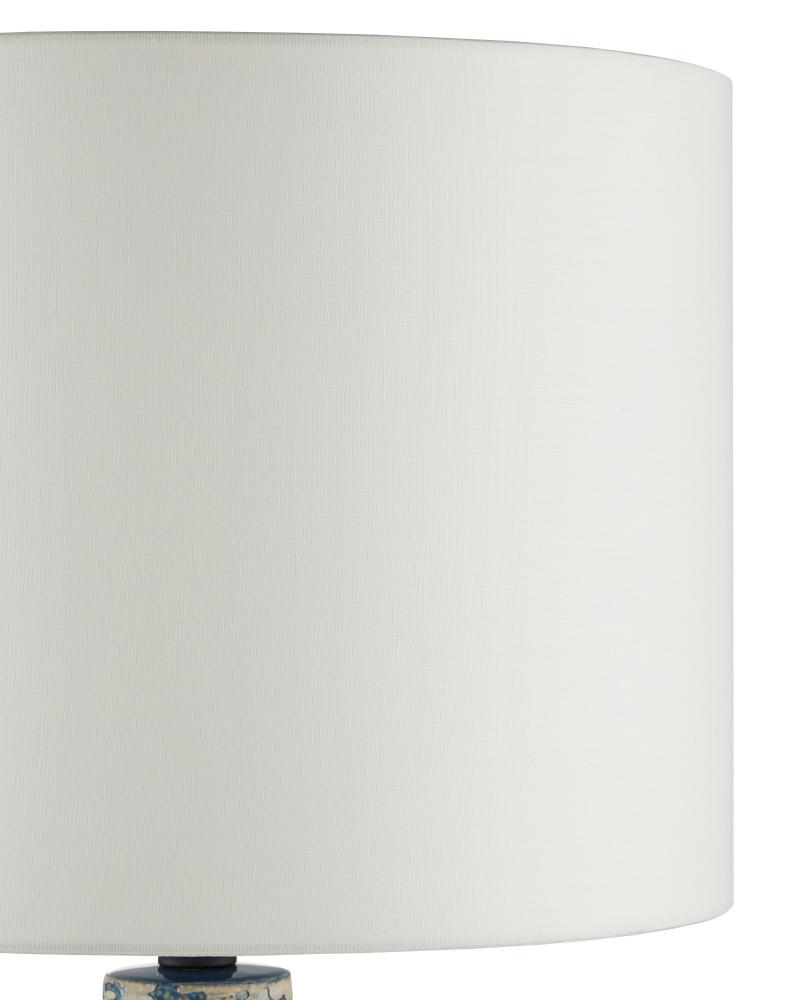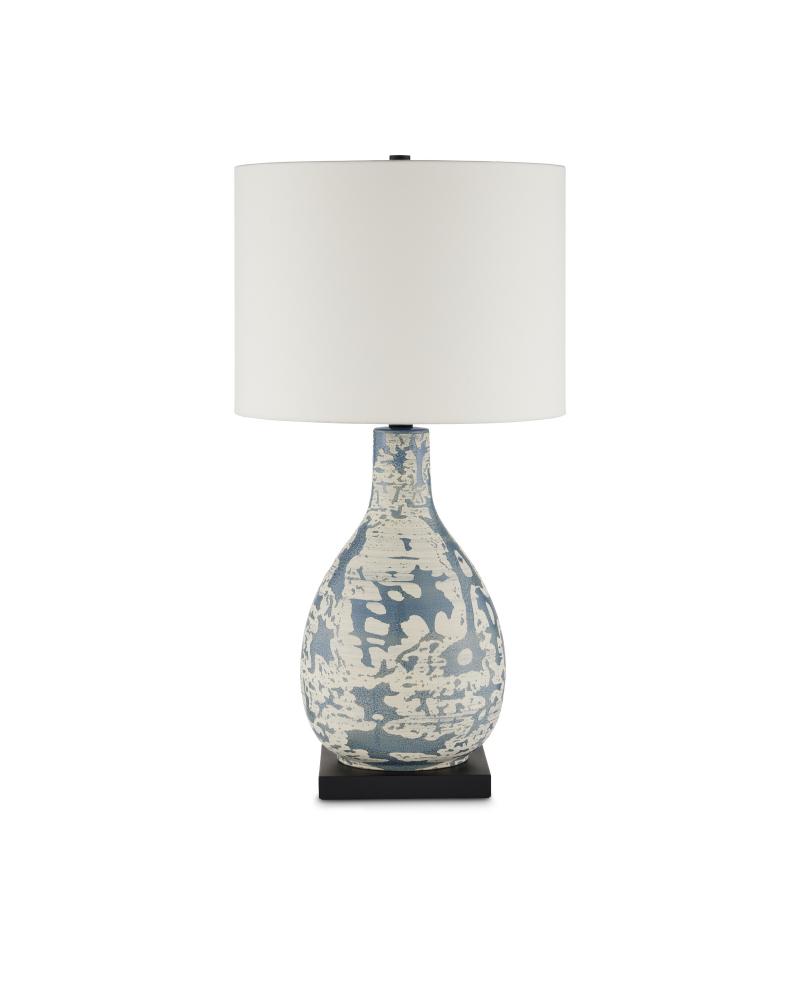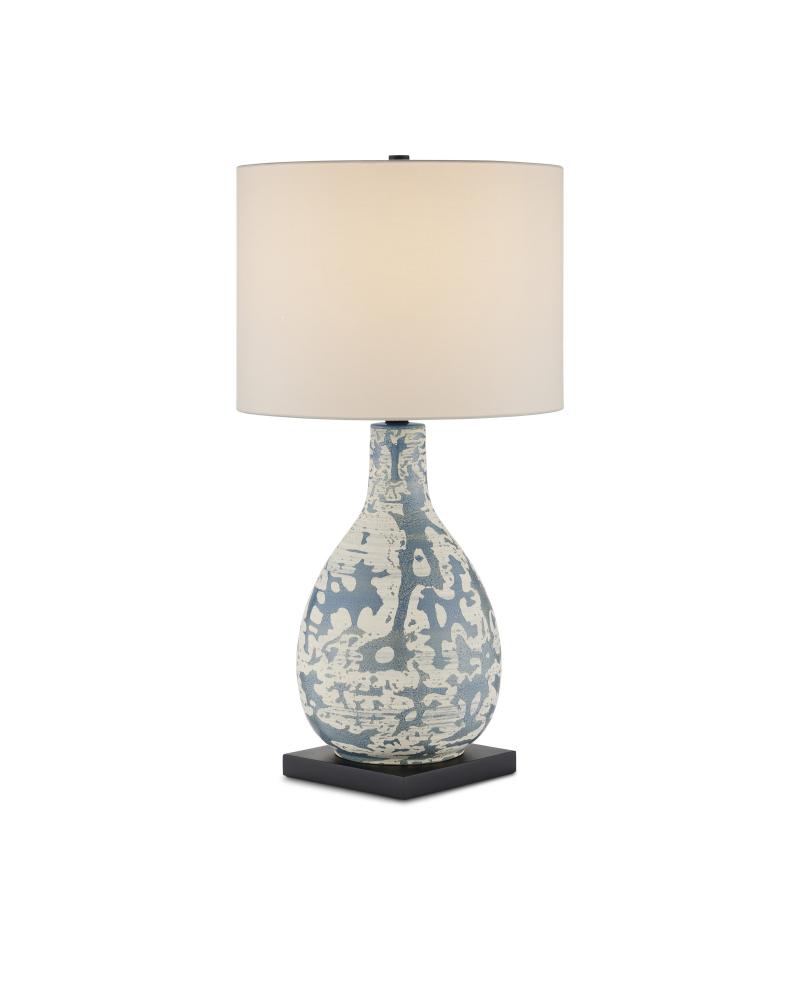 The Ostracon Table Lamp is made of ceramic with a gray and cream glazing that overlays a swirling blue pattern to give it depth. Sitting atop a black base, the blue table lamp is topped with an ivory shantung shade that echoes the creamy hues in its body.