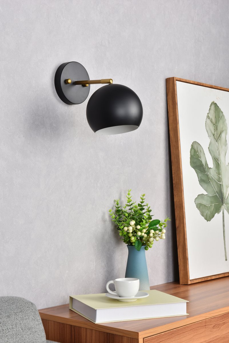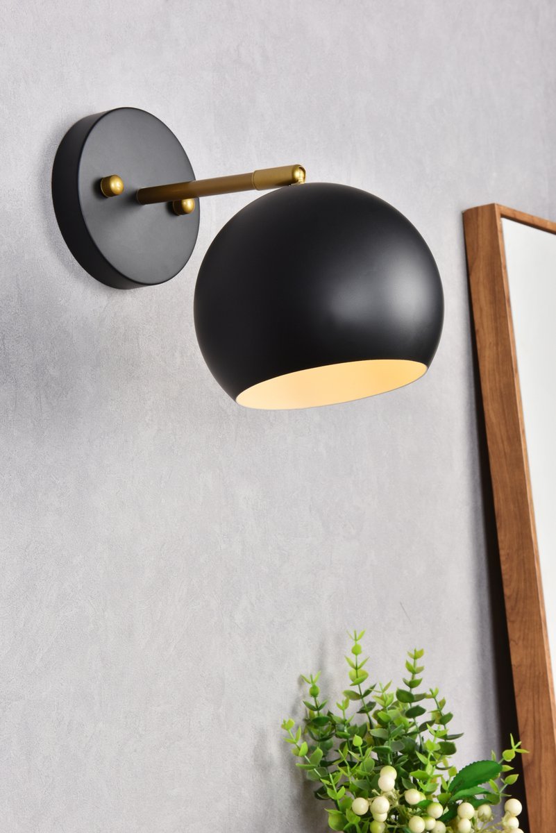 The Othello Collection wall sconce is perfect to show off a minimalistic look. Its globe design has an iron finish which gives a neutral touch and shows balance. Available in black and/or brass, this is the perfect piece to complete a space. This fixture includes a dimmable feature, and requires one E26 socket. Light bulbs not included.
