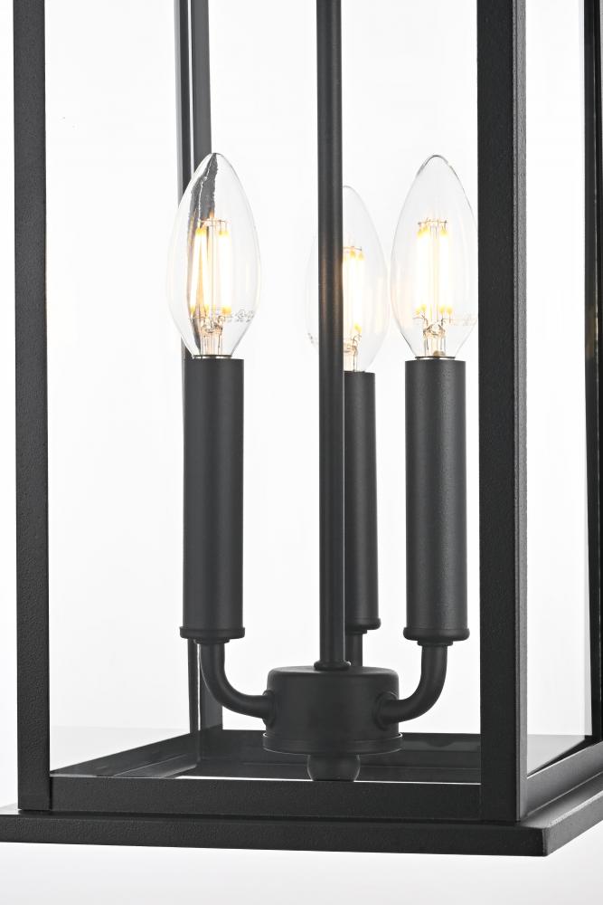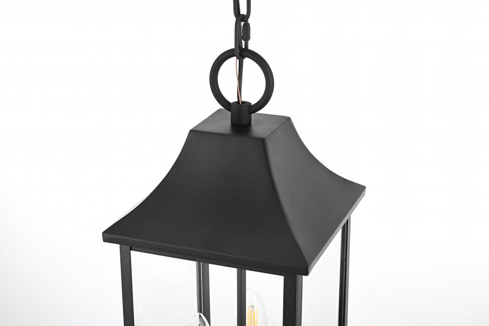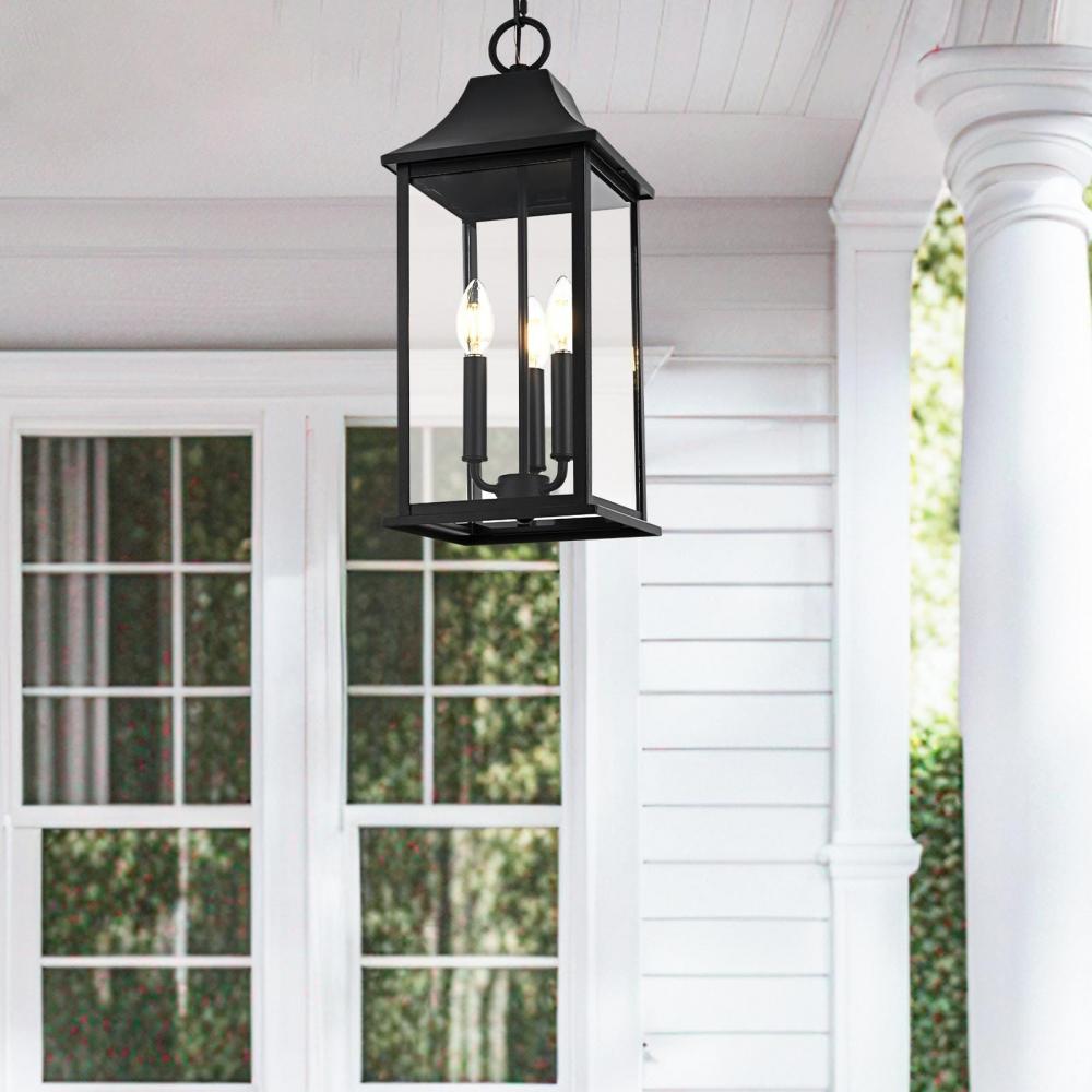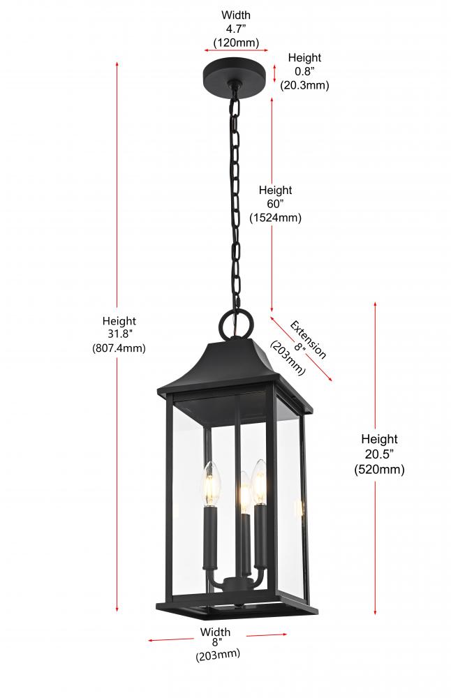 Add a striking centerpiece to your outdoor space with this exquisite hanging pendant light. Crafted from durable iron and clear glass, its tall, rectangular lantern design with a gracefully tapered roof exudes classic sophistication. The three candelabra-style bulbs offer a warm, radiant glow, amplified by the clear glass panels. Suspended by an adjustable matte black chain, this pendant light is as functional as it is visually captivating, making it an ideal choice for entryways, patios, or porches. Its weather-resistant build ensures it remains a standout feature season after season.