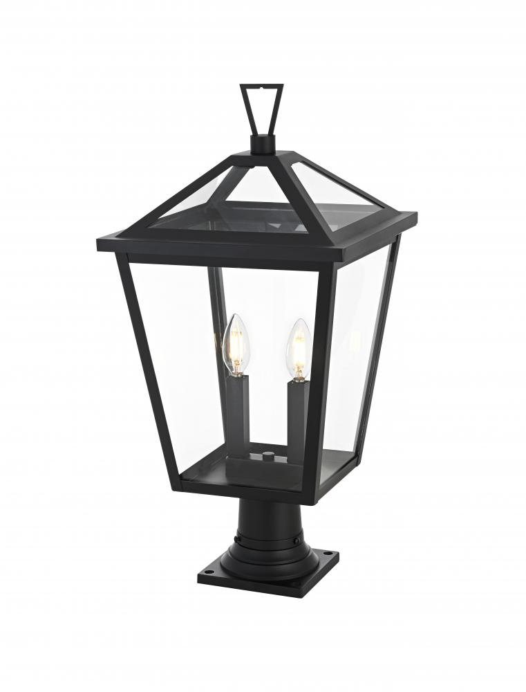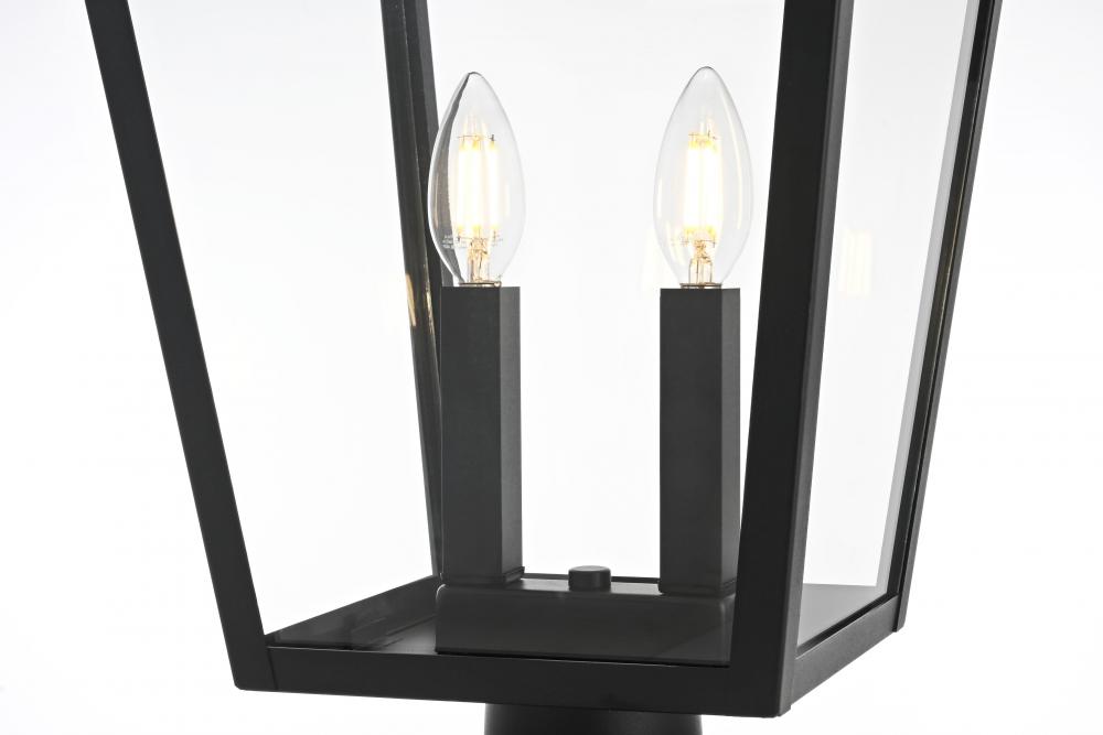 This outdoor post light is a beautiful embodiment of modern and classic design that perfectly complements any exterior home setting. Constructed from sturdy iron and clear glass, the light combines sharp architectural lines with a timeless lantern style, resulting in a statement fixture that enhances curb appeal. The angular matte black frame, topped by a stylish triangular loop, embraces an open, trapezoid-shaped structure with clear glass panels that reveal two E12 candelabra sockets. These sockets provide the ideal opportunity to incorporate flame-shaped bulbs for a warm, welcoming ambiance. Its classic look ensures versatility, making it a perfect addition to walkways, gardens, or patio posts, adding light where needed.