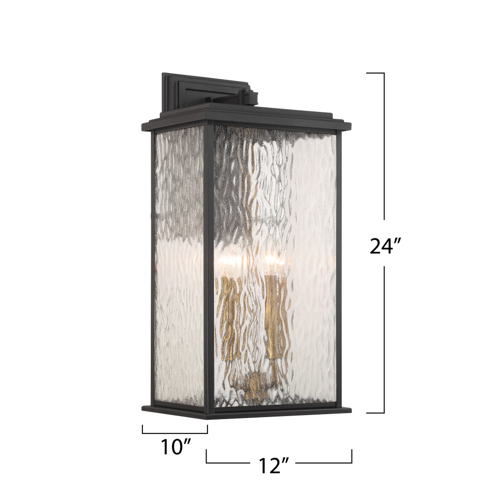 The “Estate” Collection outdoor wall sconce radiates classic allure, with its black metal frame offering a striking contrast to the mesmerizing water glass panels. Encased within, vintage brass candle covers and intricate metalwork glow warmly, evoking a sense of nostalgic charm. Perfect for enhancing any outdoor space, this sconce blends classic sophistication with modern durability.