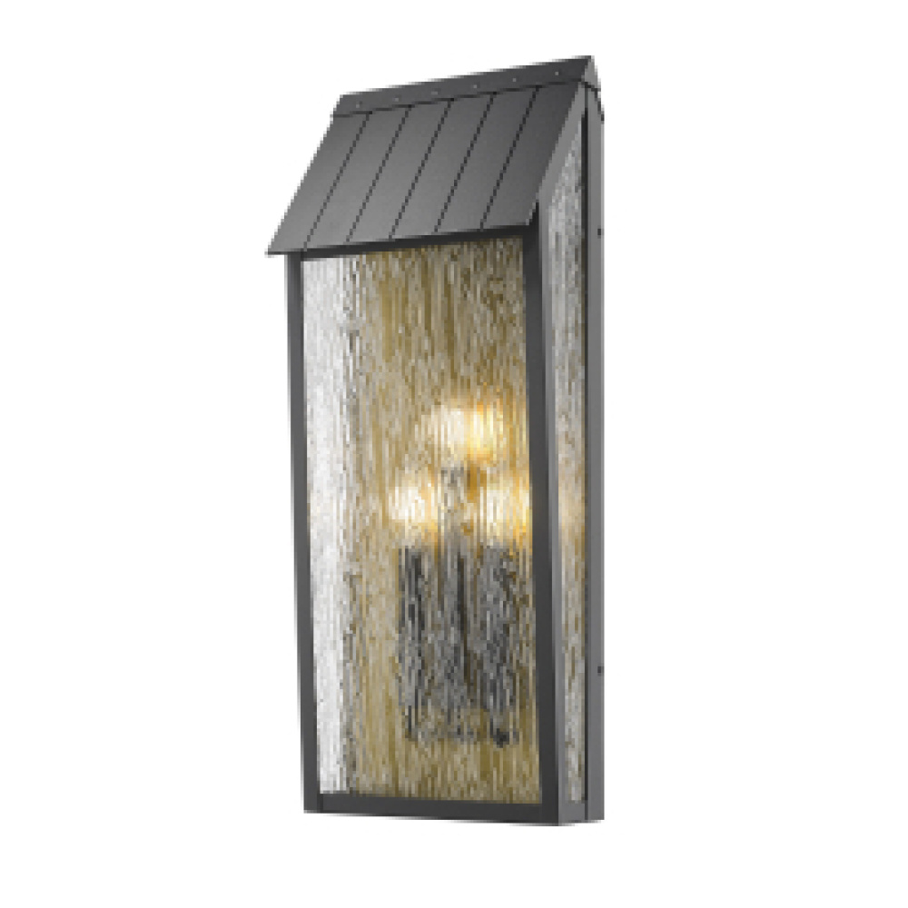 The Point collection outdoor wall sconce exudes both contemporary flair and classic allure. Its bold black frame contrasts beautifully with the warm glow of the interior brass backplate, while the rain-textured glass mimics cascading droplets, casting a soft, inviting light. Perfect for any outdoor setting, it offers both style and warmth.