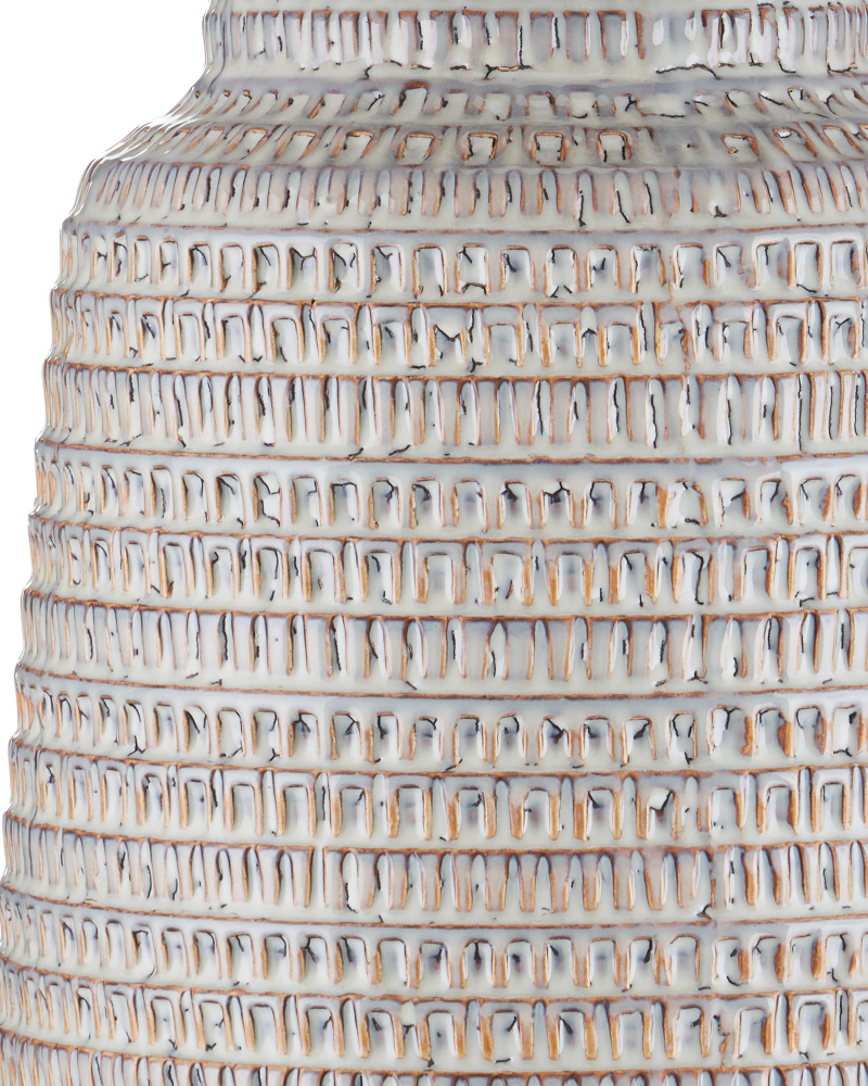 The Owen Table Lamp is made of ceramic with a tone-on-tone toothy pattern that is glazed in off-white and pale brown that creates a textural effect. Also contributing is the shade that has different patterns woven into it. The antique brass hardware and finial add to the warmth of this piece.