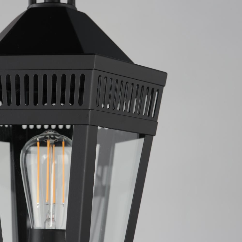 Stately lanterns with perforated filigree along the hood casts a beautiful lighting effect. Finished in Matte Black, the collection is available in multiple sizes as well as flush mount, deck lantern, and two sizes of pendants.