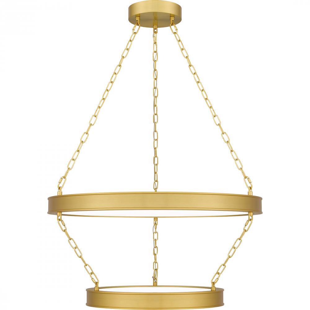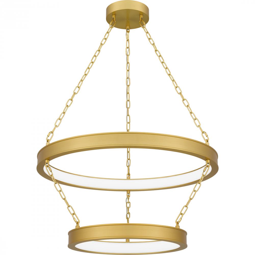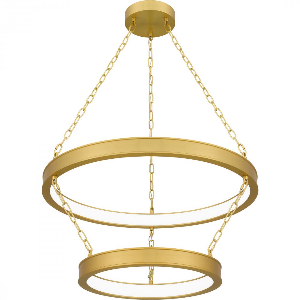 With its contemporary charm and elegance, the Ozara pendant light is a true standout piece. The layered, antique brass rings feature integrated LED light sources for a bright halo-like glow. Part of the popular Platinum by Quoizel collection, Ozara is a pe
