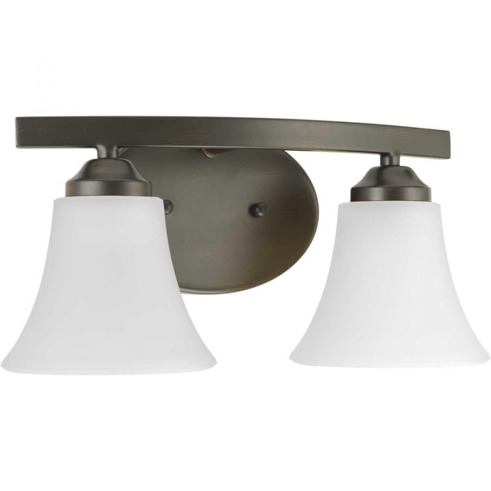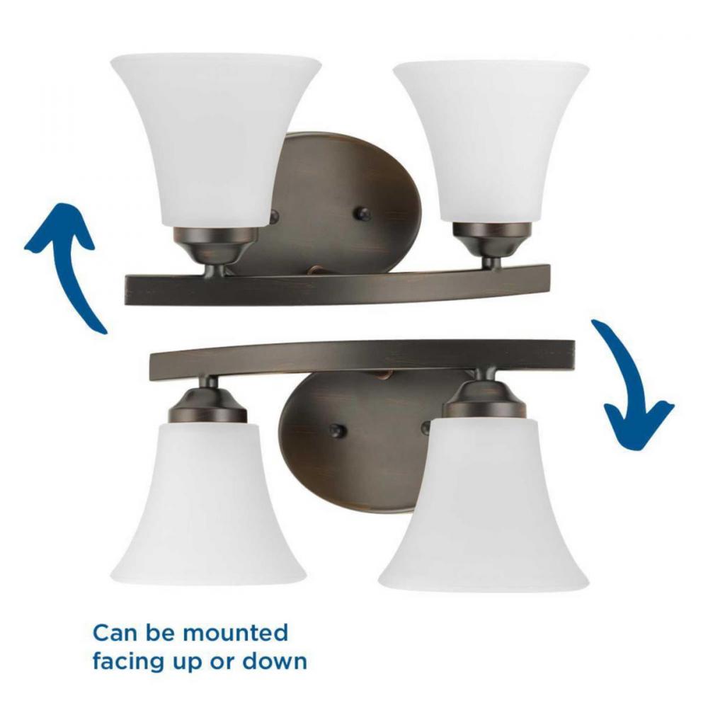 Ideal for a bathroom and powder room.;Perfect for traditional and transitional style settings;Handsome antique bronze finish;Elegant etched glass shades;Mount the light fixture facing up or down;Use 2 medium base bulbs that are sold separately (100 W max -