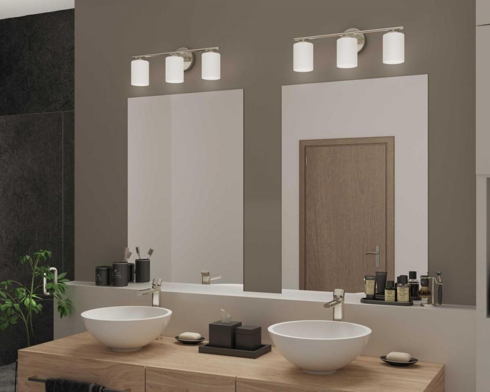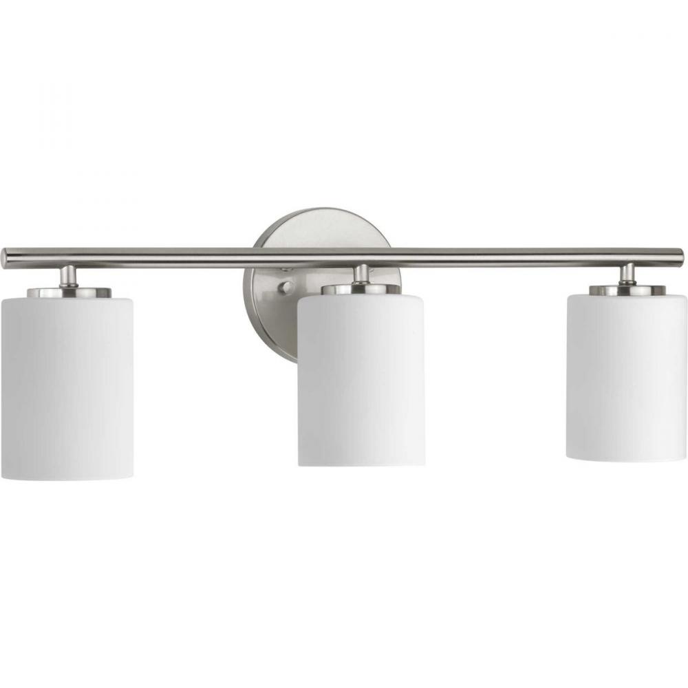 Three-light bath & vanity from the Replay Collection, smooth forms, linear details and a pleasingly elegant frame enhance a simplified modern look. Fixture can be mounted up or down. Brushed Nickel finish.