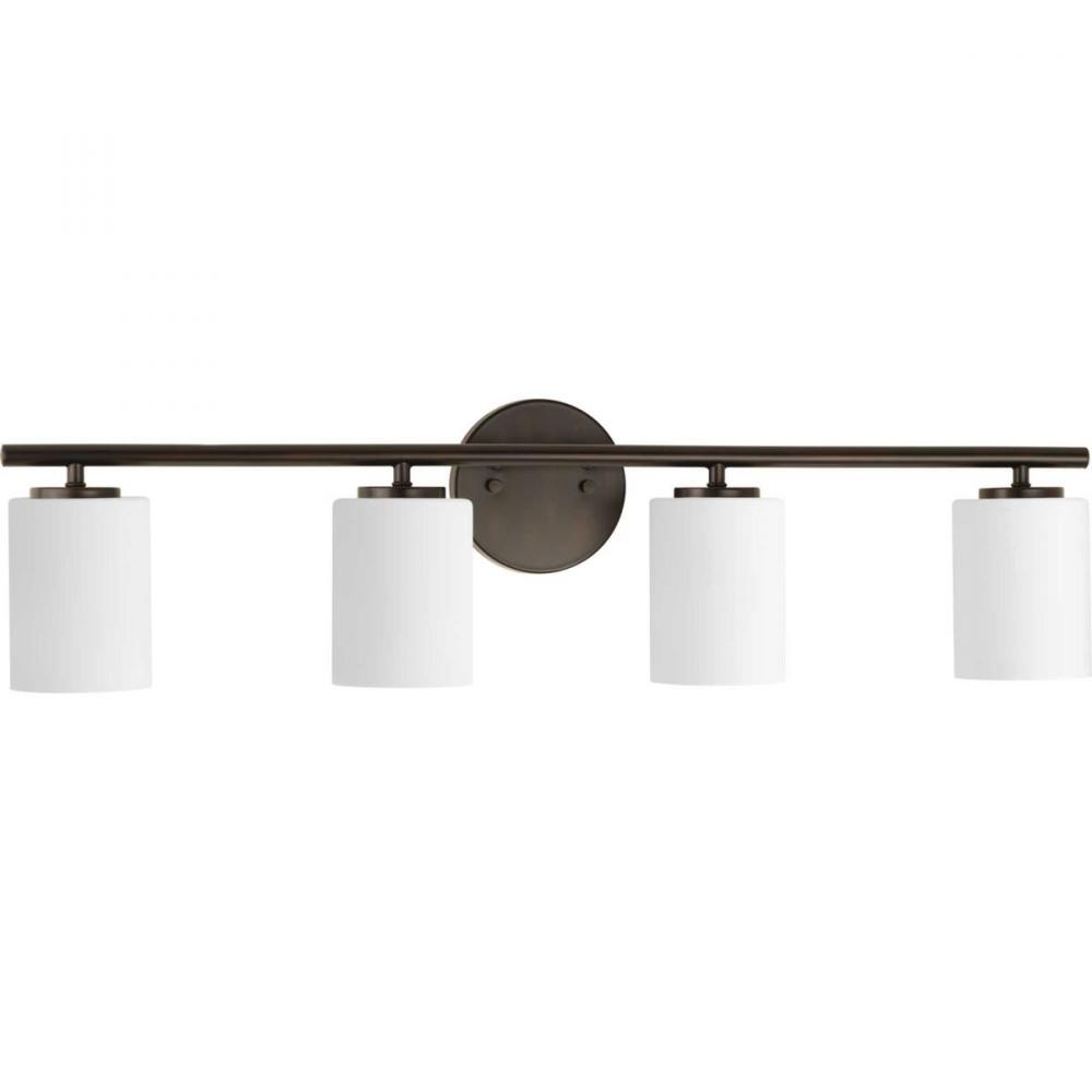 Ideal for a bathroom;Perfect for modern and transitional style settings;Handsome antique bronze finish;Elegant etched painted white glass shades;Mount the light fixture facing up or down;Use 4 medium base bulbs that are sold separately (100 W max - LED/CFL