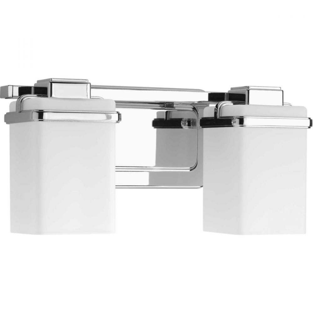 Enjoy a cool and sleek modern design with the two-light bath & vanity in the Metric Collection. A simple, etched opal glass shade nestles inside a die-cast frame - that is finished in Polished Chrome - providing light above and below the fixture.
