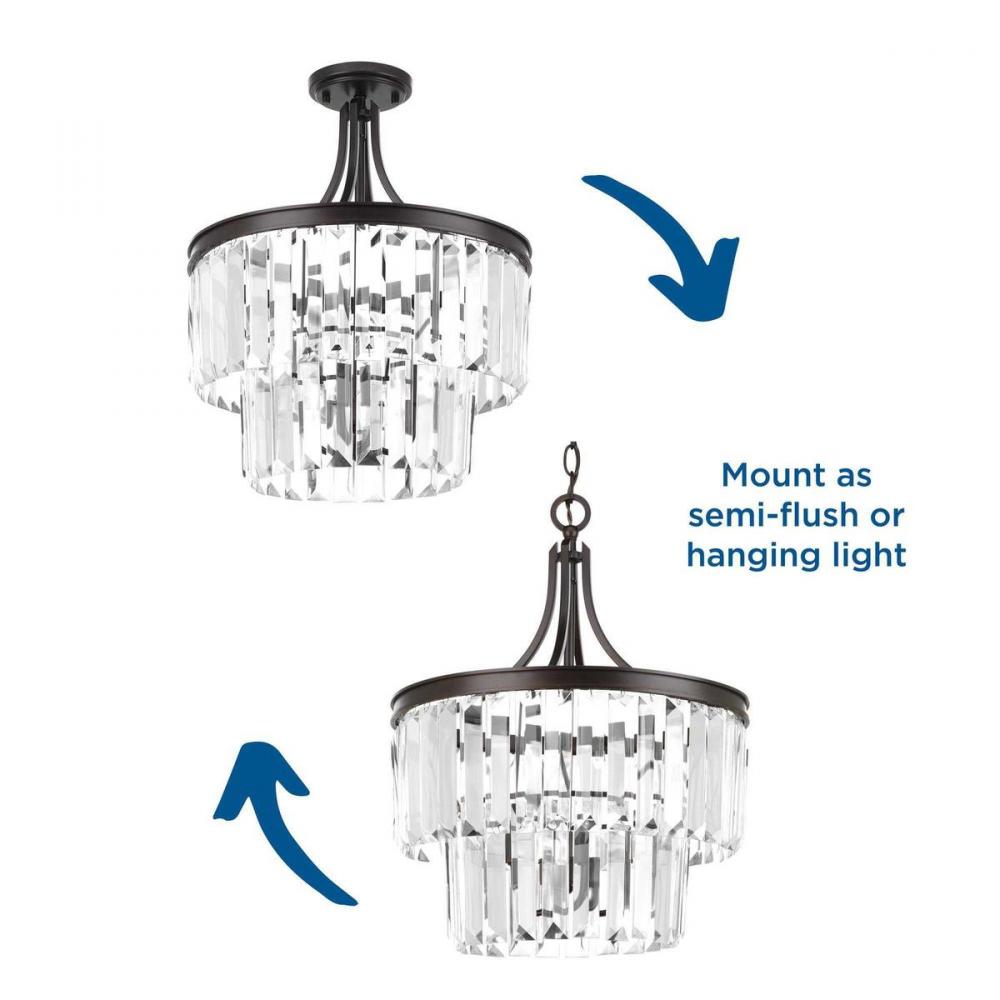 Glimmer fits the definition of livable luxury with elements that sparkle to create an instant statement within the home. Prismatic glass three-light pendants are supported by an architecturally- styled frame in Antique Bronze finish. The cascade of faceted linear glass deliver a sleek silhouette to any room. This versatile 19" round fixture in Antique Bronze can also be mounted as a semi-flush.