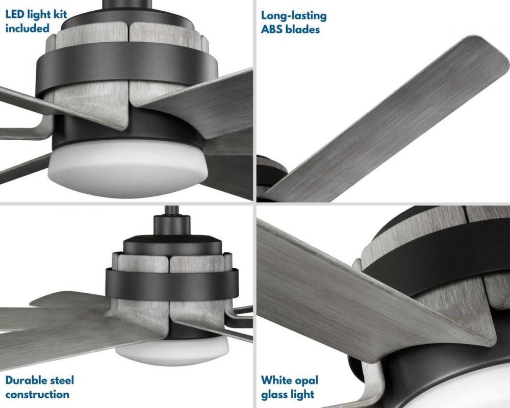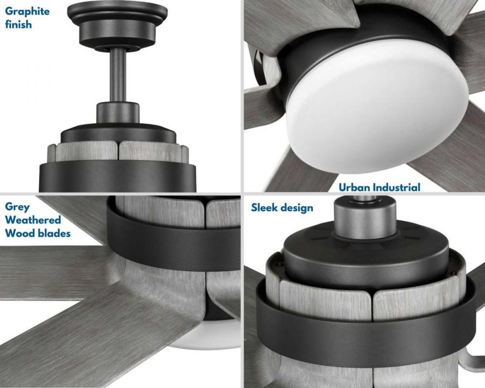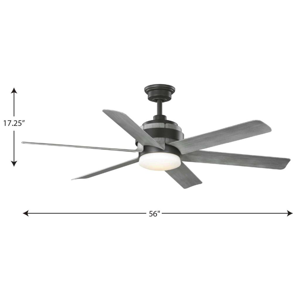 Offer modern industrial style with the Kaysville Collection 6-Blade Grey Weathered Wood 56-Inch DC Motor LED Urban Industrial Ceiling Fan. The canopy, DC motor, and smooth metal band are coated in a gorgeous graphite finish and are complemented by grey weathered wood blades. The long blades are crafted from a strong, all-weather ABS material to prevent warping. A full-function 6-speed remote control with batteries is included so you can adjust full-range dimming and fan speed without breaking a sweat. For ideal illumination, an integrated LED source is included (24w max/2,100 lumens per LPW/120v/90CRI). Dimmable. The ceiling fan's modern industrial design is ideal for any living room in urban industrial style settings. It's time to breathe new life into the mundane every day with timeless and truly transformative lighting. Make your purchase today to begin your journey to a whole new lighting experience. Progress Lighting products are designed for exceptional quality, reliability, and functionality.