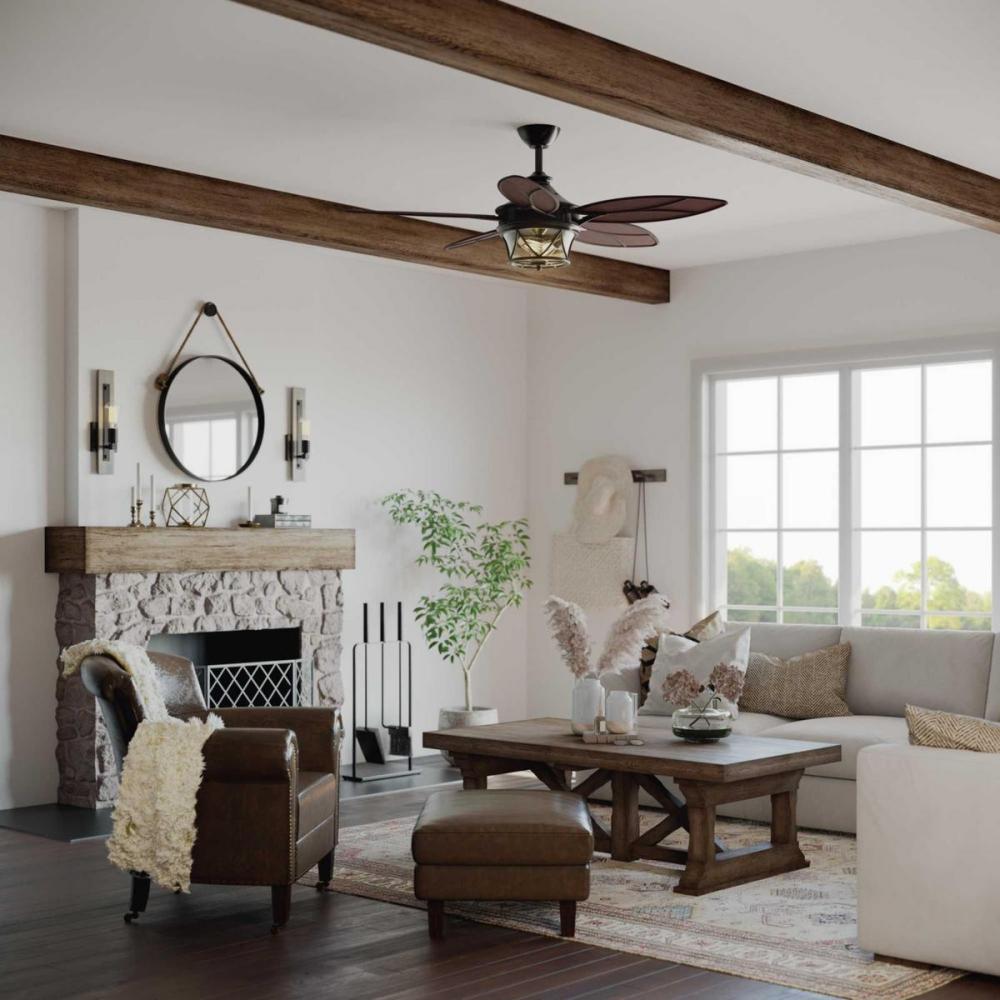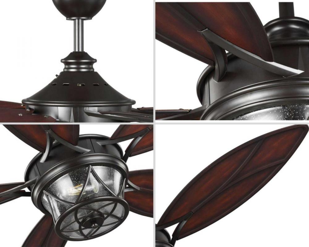 Five blades decorated in a leaf-like design sprout from the center.;An LED light source is artistically covered by a clear seeded glass shade.;Infuse a warm, nature-inspired style to your outdoor home décor with this one-of-a-kind ceiling fan.;Ideal for a