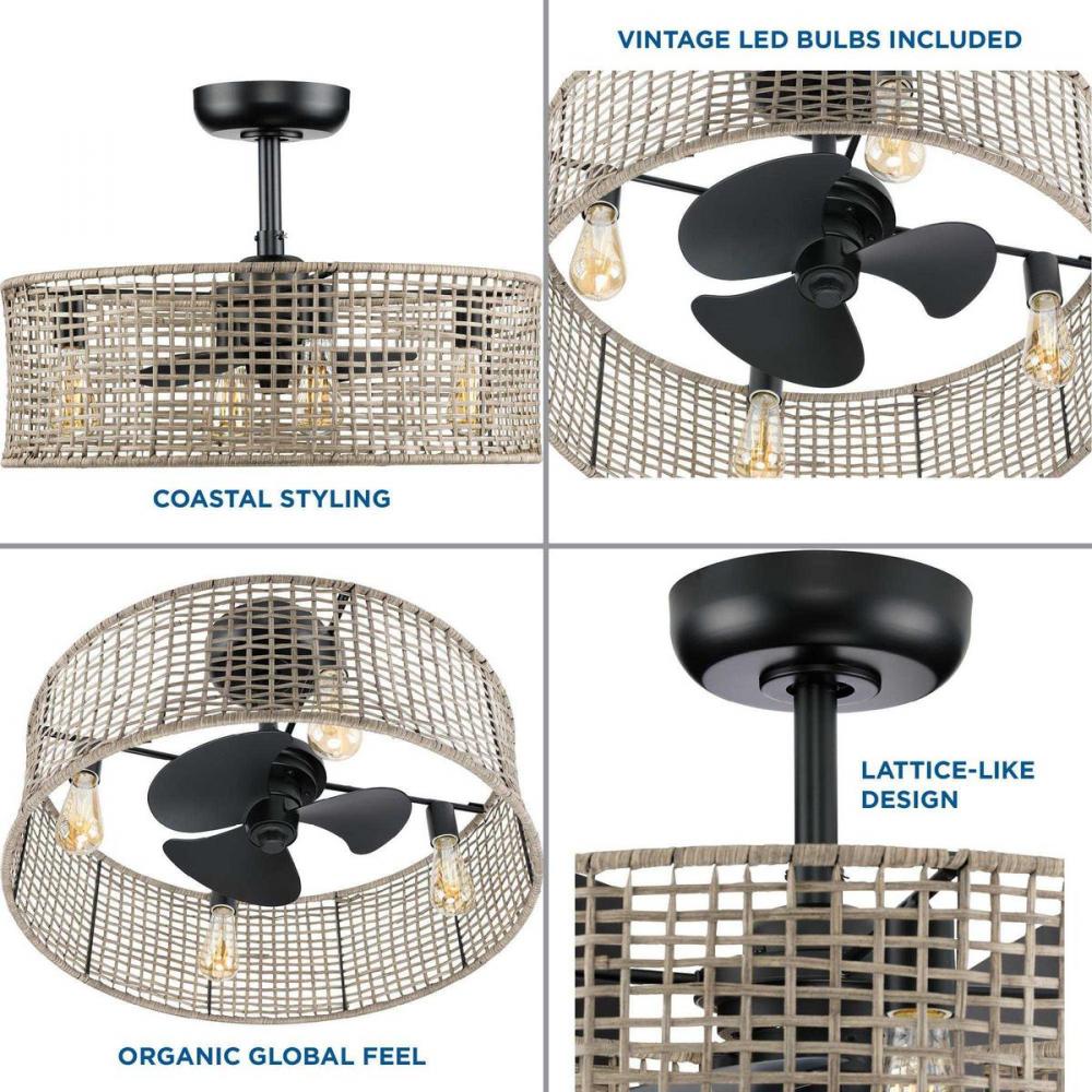APPLICATION: Ideal for any great room, bedroom, living room, or bonus room.;STYLES: Perfect for farmhouse, rustic, and coastal style settings.;BLADES: 3 matte black blades rotate within the natural wicker frame with a charming lattice-like design coated in