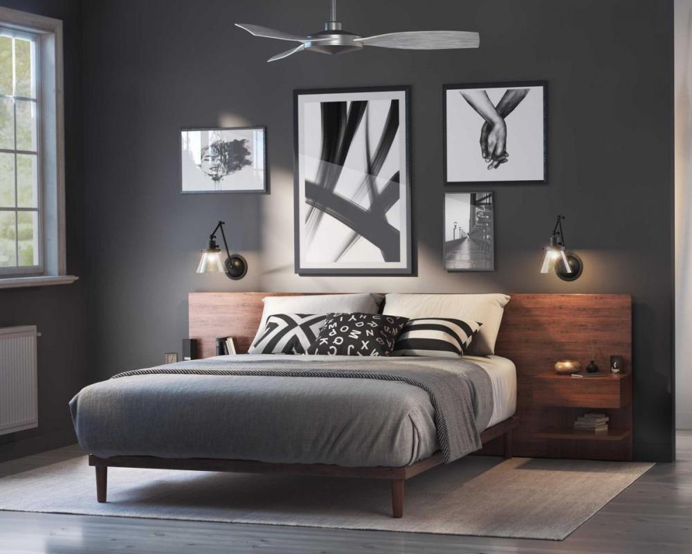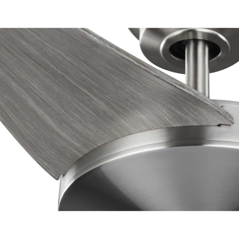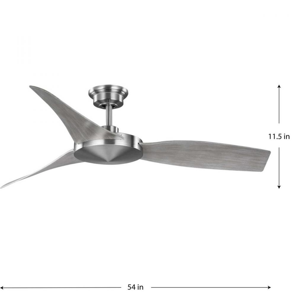 Embrace a unique and stylish 54" ceiling fan from the Spicer Collection. Three curved ABS blades with a grey weathered wood finish rotate around a beautiful low profile brushed nickel center for a contemporary design that will find a home in a variety of indoor and outdoor living spaces. Energy-efficient DC motor provides added cost savings. Not light kit compatible.