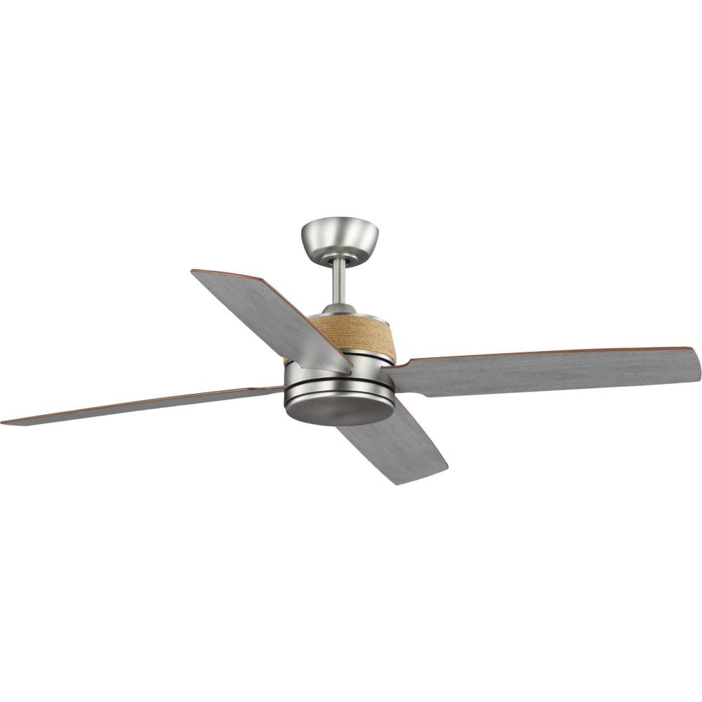 Natural jute rope offers modern organic styling to the housing of the Schaffer four-blade ceiling fan, softening the housing’s look and making it perfect for coastal and global spaces. This 52-inch ceiling fan has four reversible plywood blades offered in a choice of Classic Walnut and Grey Weathered Wood with an Antique Nickel housing, An 18W integrated LED module delivers soft, 3000K 90 CRI illumination through a white opal glass shade. Its UL damp rating makes this lovely fan ideal for use inside or in outdoor covered areas. A 3-speed remote control and wall bracket are included.