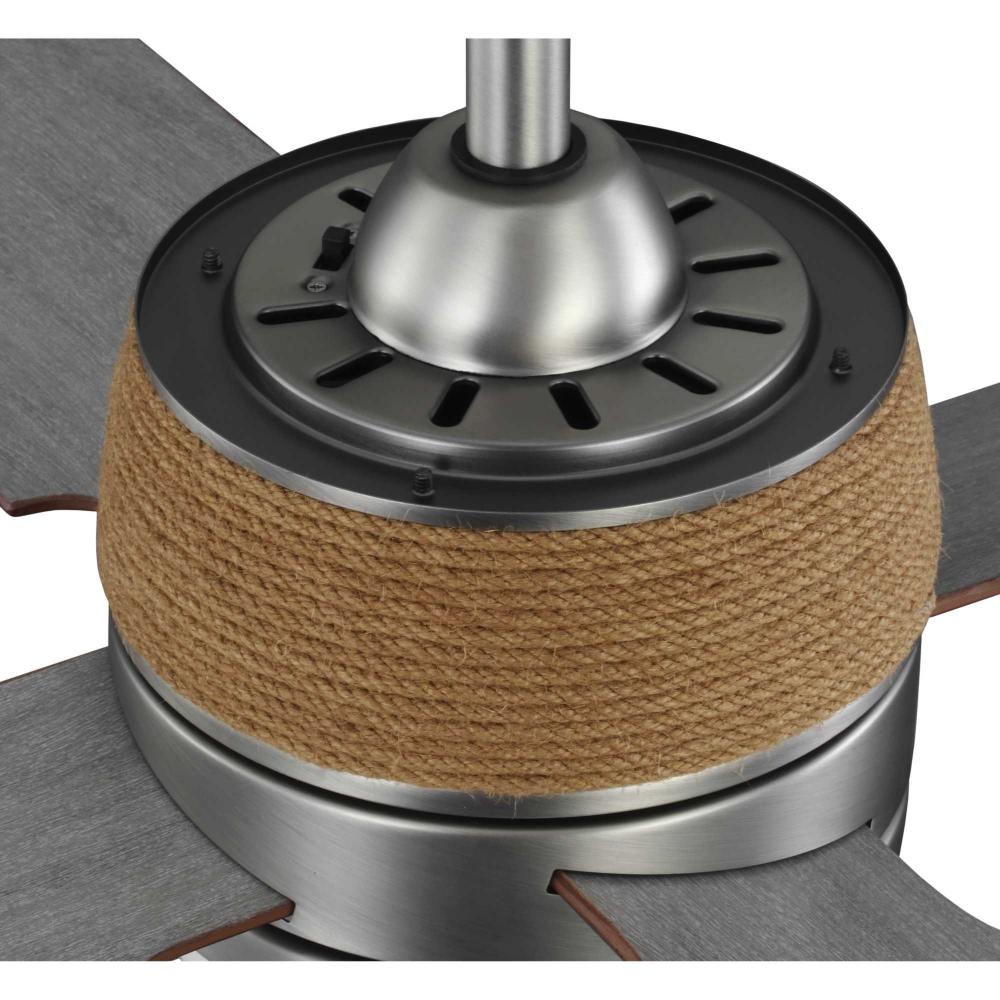The fan is finished in antique nickel and accented by an organic jute rope with four reversible blades coated in a lovely classic walnut and grey weathered wood finishes