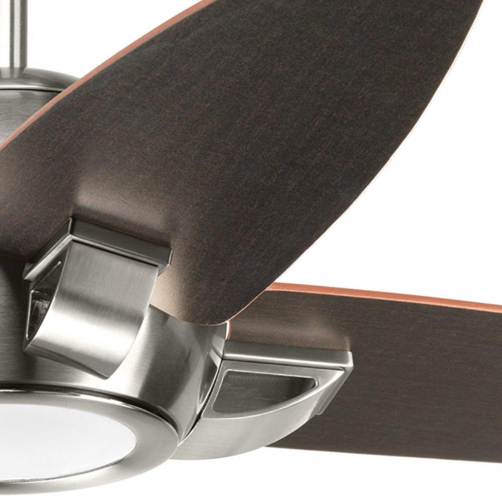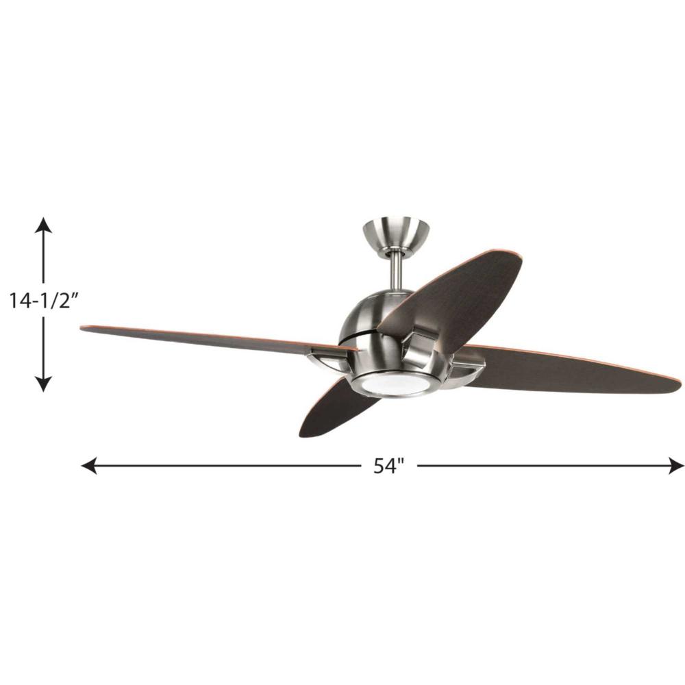 Four-blade 54" Soar ceiling fan features an LED light source, offering both form and function with energy- and cost-savings benefits;Soar ceiling fan features Black blades with a Brushed Nickel finish;Indoor ceiling fan ideal for use in great rooms, li