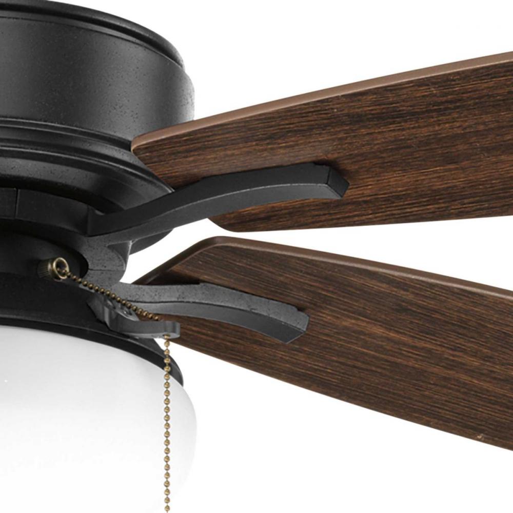 52" Billows collection ceiling fan features an LED light source, offering both form and function with energy- and cost-savings benefits;Five reversible Medium Cherry/Toasted Oak blades;Billows collection ceiling fan with Forged Black finish;Pull chain