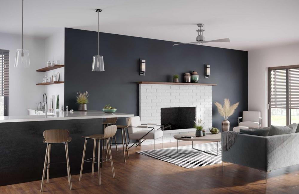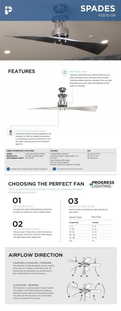 56" Spades ceiling fan features a sleek and contemporary two-blade design;Features silver blades and a Brushed Nickel finish;Spades features a dual mount system, an energy saving DC motor and ABS composite blades;A full function remote control with bat