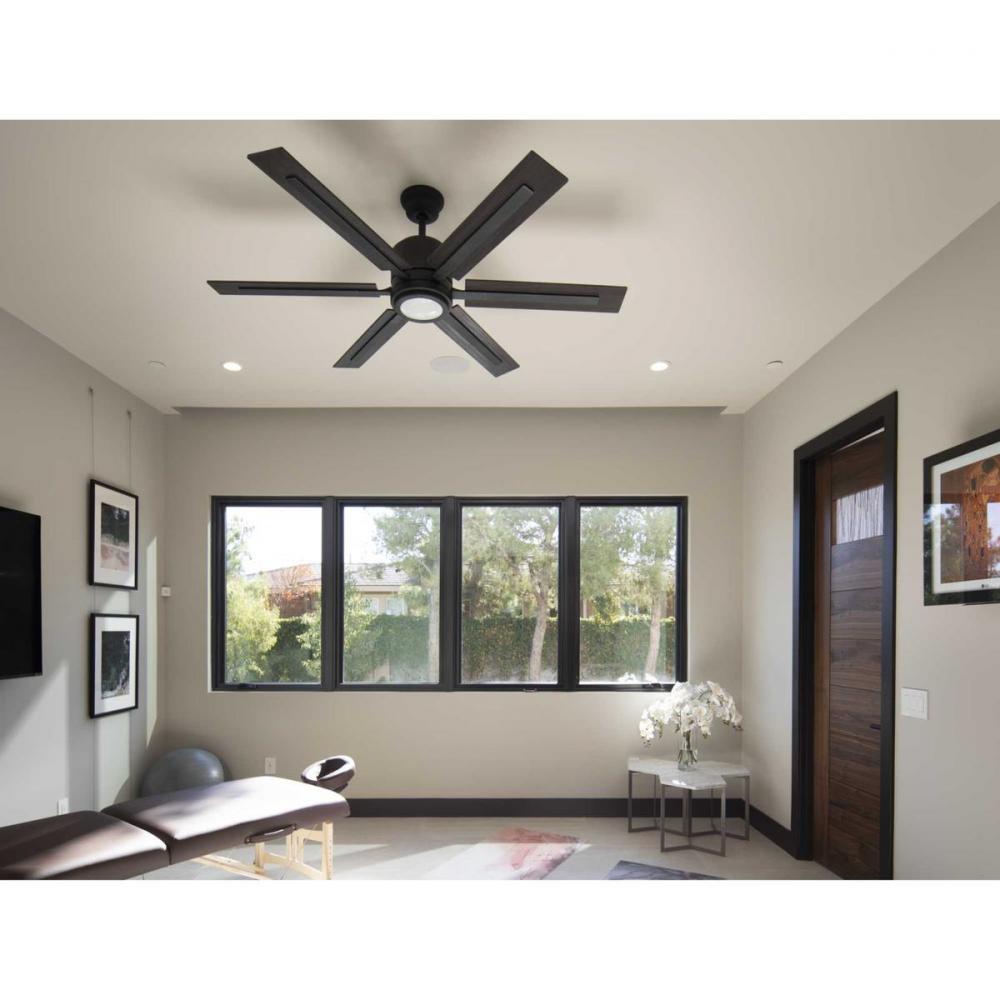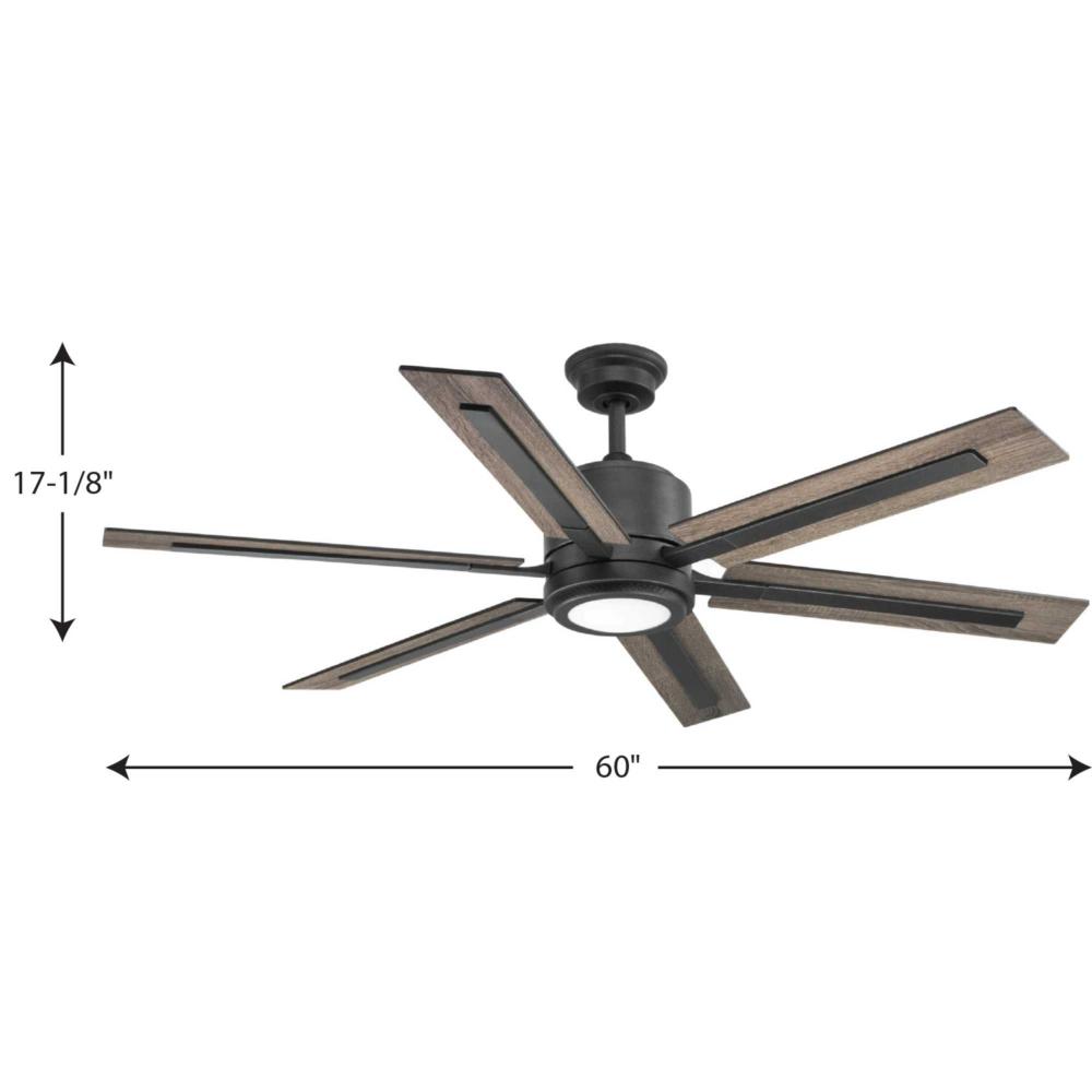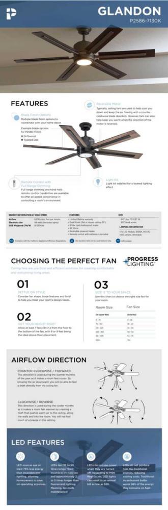 60" Glandon six-blade indoor ceiling fan;The 60" Glandon ceiling fan features a dimmable 17W LED module with a shatterproof white opal shade;3000K color temperature, 90CRI LED replaceable light module and 1400 lumens (source);Glandon ceiling fan fe
