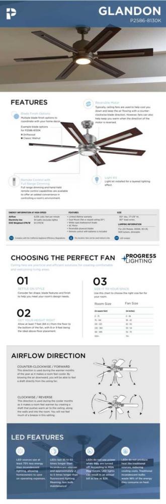 60" Glandon indoor ceiling fan features six blades and an LED light source, offering both form and function with energy- and cost-savings benefits;Shatterproof white opal shade features a dimmable 17W LED module;3000K color temperature, 90CRI LED repla