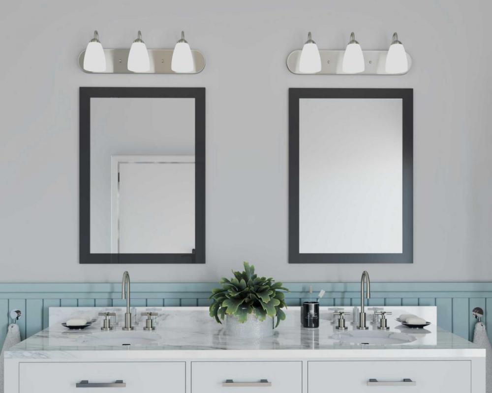 Ideal for a bathroom or great room;Perfect for traditional and transitional style settings;Beautiful brushed nickel finish;Elegant etched glass shades;Mount the light fixture facing up or down;Use 3 medium base bulbs that are sold separately (100 W max - L