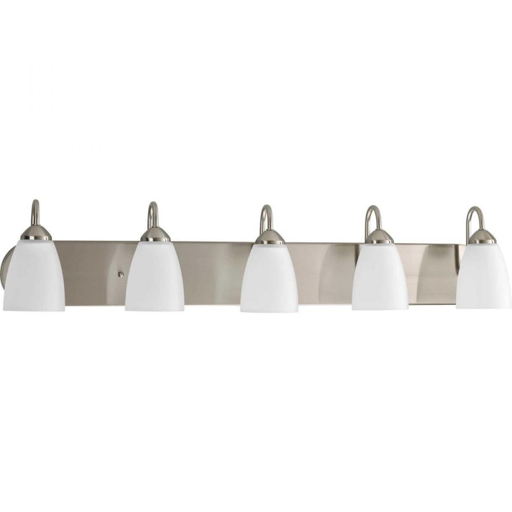 Gather possesses a smart simplicity to complement today's home. This five-light bath bracket contains etched glass shades which add distinction and provide pleasing illumination to your room. Featuring a glamorous Brushed Nickel finished frame, this collection allows you to decorate an entire home with confidence and style.