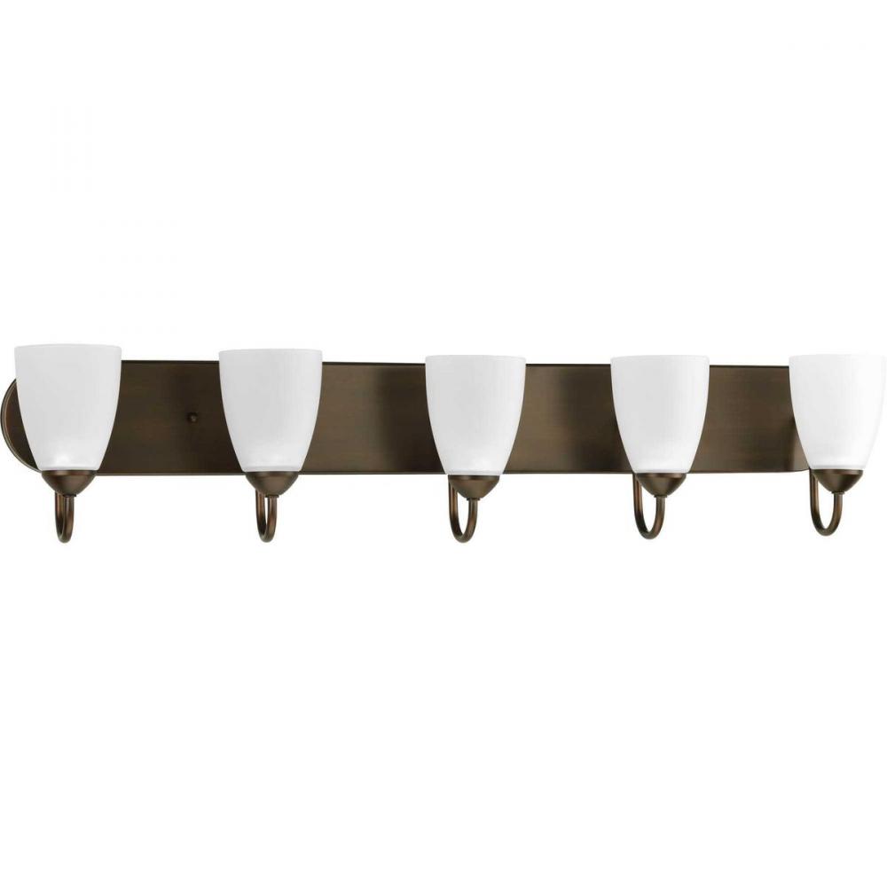 Gather possesses a smart simplicity to complement today's home. This five-light bath bracket contains etched glass shades which add distinction and provide pleasing illumination to your room. Featuring a beautiful Antique Bronze finished frame, this collection allows you to decorate an entire home with confidence and style.