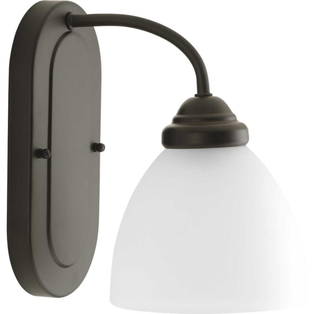 The Heart Collection possesses a smart simplicity to complement today's home. This one-light bath bracket includes etched glass shades to add distinction and provide pleasing illumination to any room. Versatile design permits installation of fixture facing either upwards or downwards. Painted antique bronze scroll arms create an airy effect.