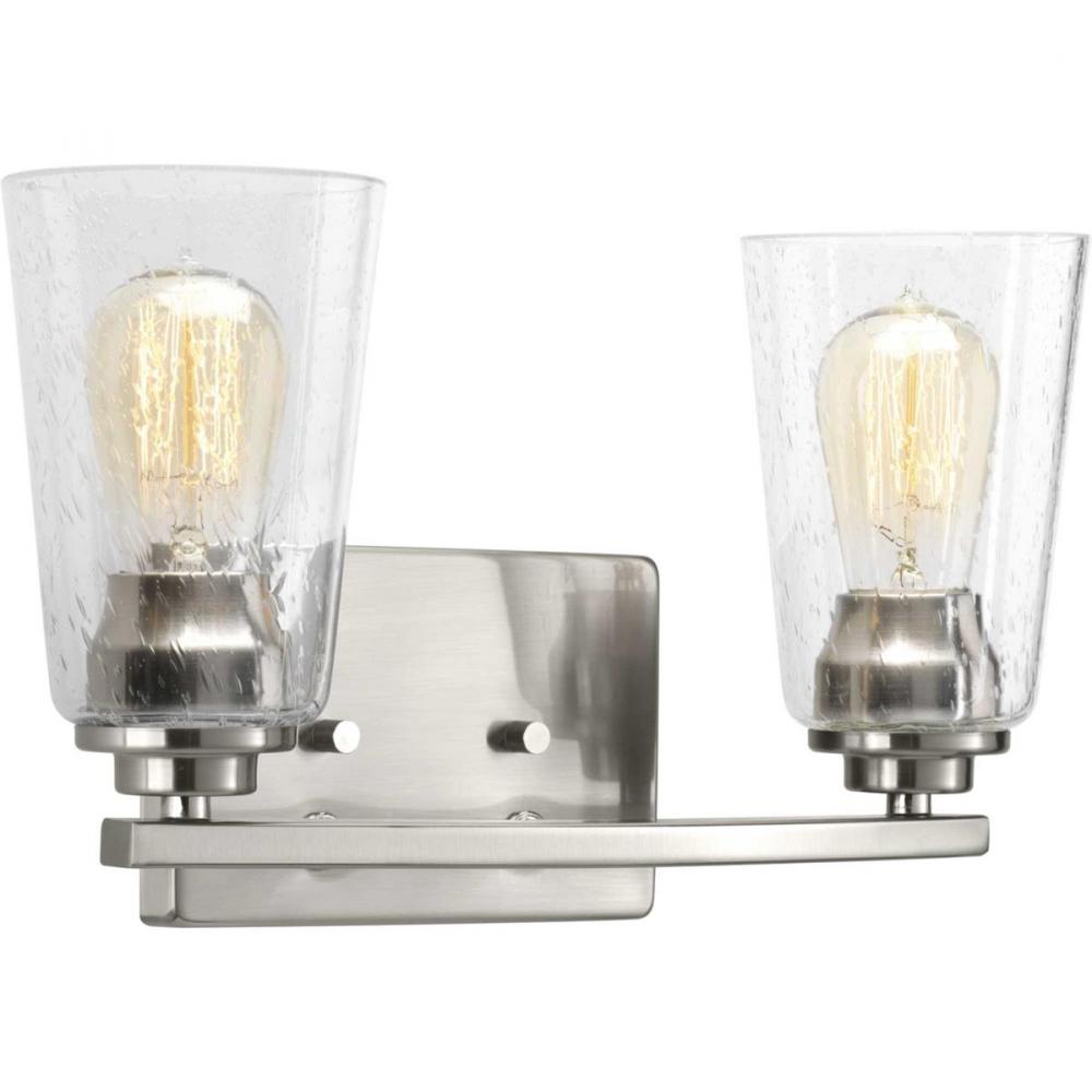 A new category of vintage modern fixtures takes center stage with this two-light bath & vanity fixture from one of our Design Series collections. Delicate details in a Brushed Nickel finish, create statement making focal pieces for a variety of interiors. Debut provides a fitting stage to feature nostalgic, vintage lamps. Glass accessory shades available in clear or frosted seeded finishes.