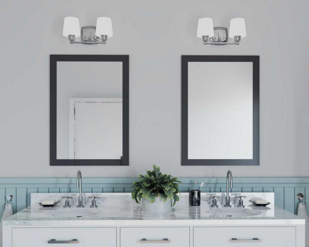 Ideal for a bathroom and powder room.;Perfect for farmhouse and transitional style settings;Crisp polished chrome finish;Elegant etched white linen glass shades;Mount the light fixture facing up or down;Use 2 medium base bulbs that are sold separately (100