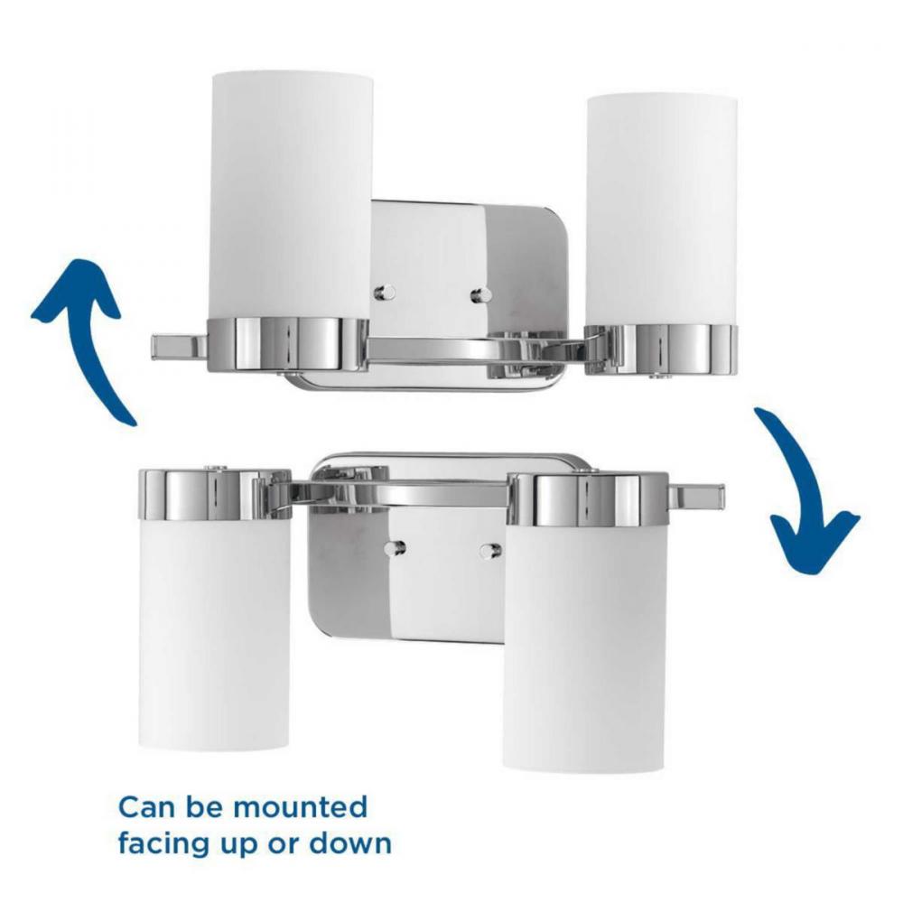Achieve a mid-century modern look with Elevate, which boast an etched white glass shade and a frame inspired by Space Age styling in a Polished Chrome finish. This two-light bath is part of our Design Series collections. Fixture can be installed with glass facing up or down.