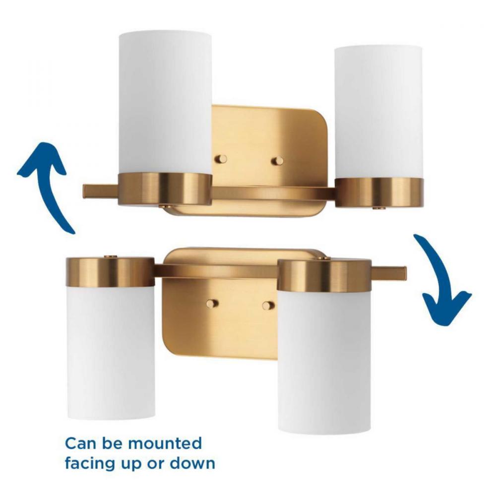 Achieve a mid-century modern look with Elevate, which boast an etched white glass shade and a frame inspired by Space Age styling in a Brushed Bronze finish. This two-light bath is part of our Design Series collections. Fixture can be installed with glass facing up or down.