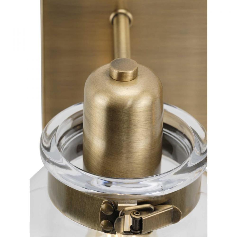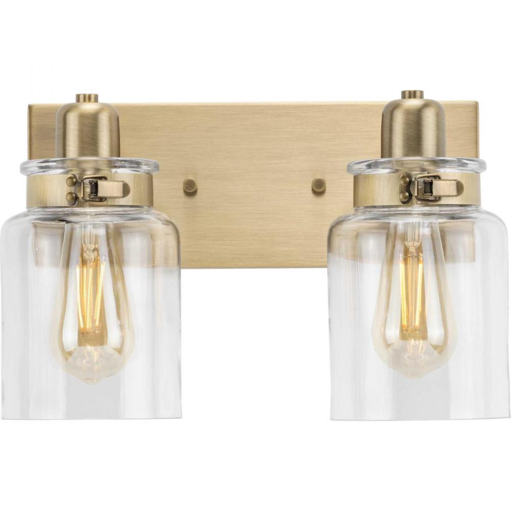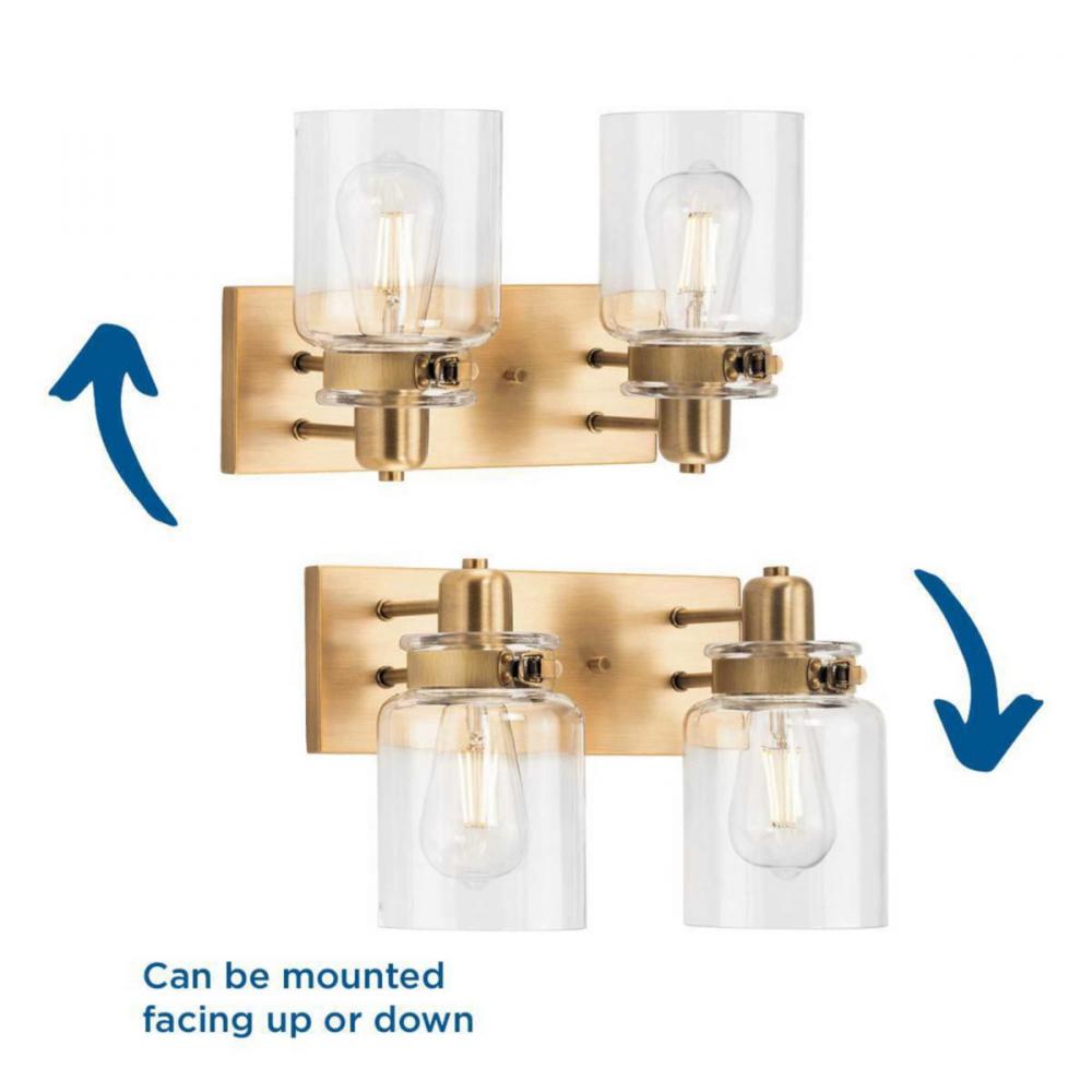 Ideal for a bathroom or powder room;Perfect for farmhouse, urban industrial, and transitional style settings;Golden vintage brass finish;Cylindrical clear glass;Mount the light fixture facing up or down;Uses 2 medium base base bulbs that are sold separatel