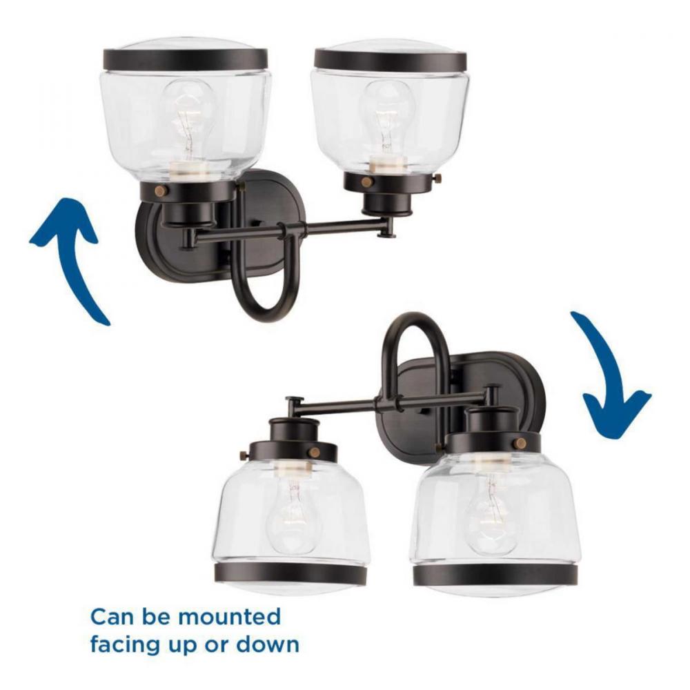 Ideal for a bathroom and powder room.;Perfect for farmhouse and vintage electric style settings;Handsome antique bronze finish;Crisp clear glass shades;Mount the light fixture facing up or down;Use 2 medium base bulbs that are sold separately (75 W max - L
