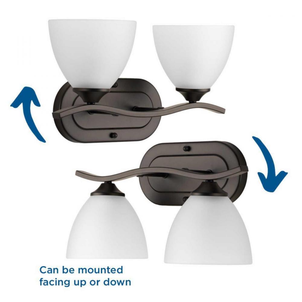 Ideal for a bathroom and powder room.;Perfect for traditional and transitional style settings;Handsome antique bronze finish;Elegant etched glass shades;Mount the light fixture facing up or down;Use 2 medium base bulbs that are sold separately (100 W max -