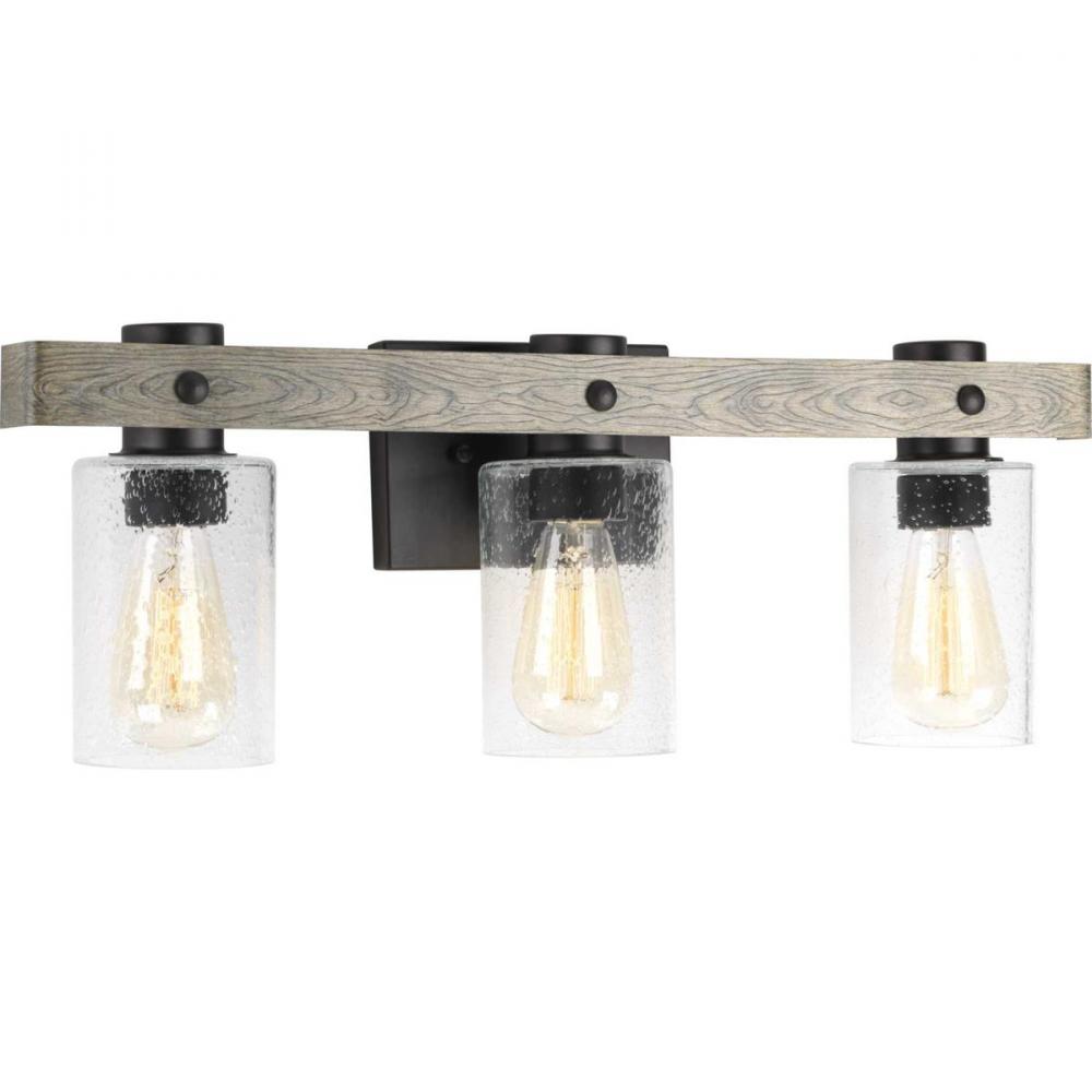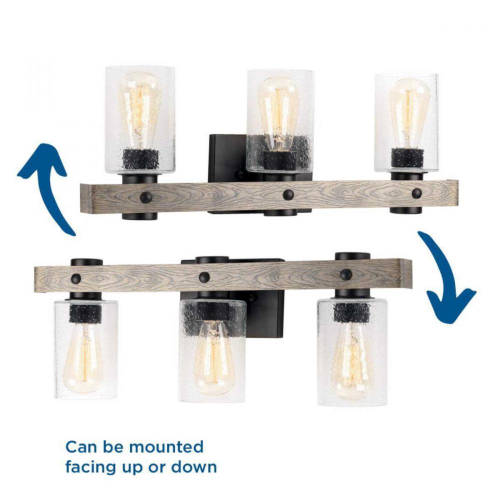 Ideal for a bathroom;Perfect for coastal, farmhouse, rustic, and urban industrial style settings;Gorgeous graphite finish with faux painted weathered driftwood accents;Rustic clear seeded glass shades;Mount the light fixture facing up or down;Use 3 medium