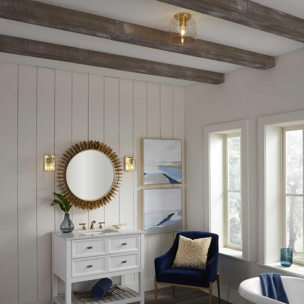 Fundamentally modern but with a traditional twist, the Adley vanity light combines a clear glass shade with a curved edge backplate and a simple, straight bar finished in lustrous satin brass. This light is an elegant choice for illuminating new traditional and transitional settings.