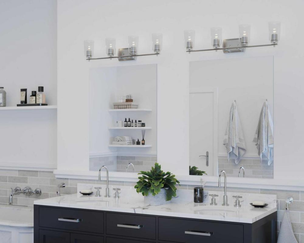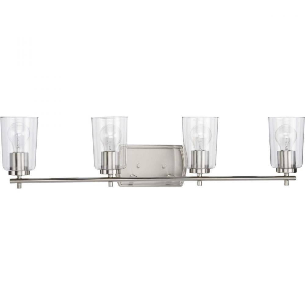 For the ultimate ambient lighting experience for bathroom or vanity setting that seeks illumination, look no further than the Adley four-light bath. A Brushed Nickel, curved backplate and simple, straight bar hold classic, clear glass shades, making it an excellent choice for new traditional and transitional settings.