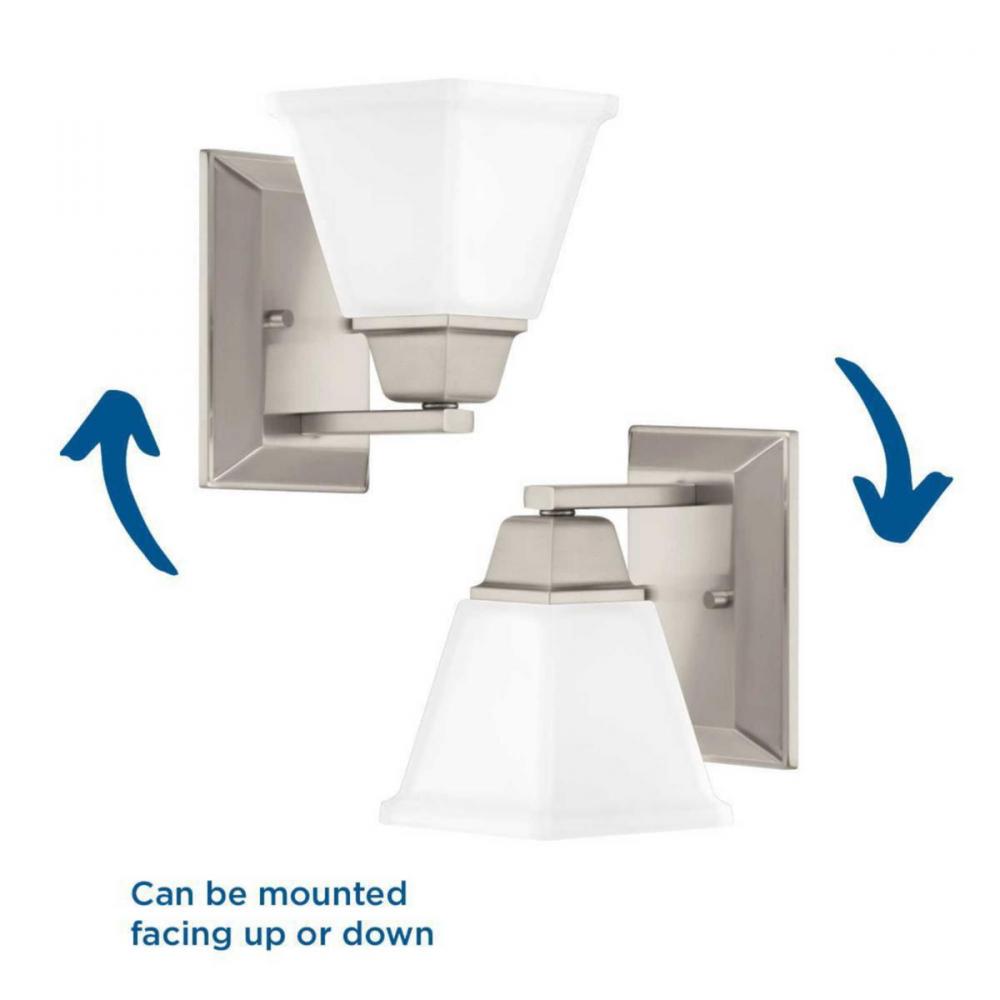 Ideal for a bathroom, hallway, or foyer;Perfect for craftsman, farmhouse, modern, and modern craftsman style settings;Beautiful brushed nickel finish;Elegant etched glass shade;Mount the light fixture facing up or down;Use 1 medium base bulb that is sold s