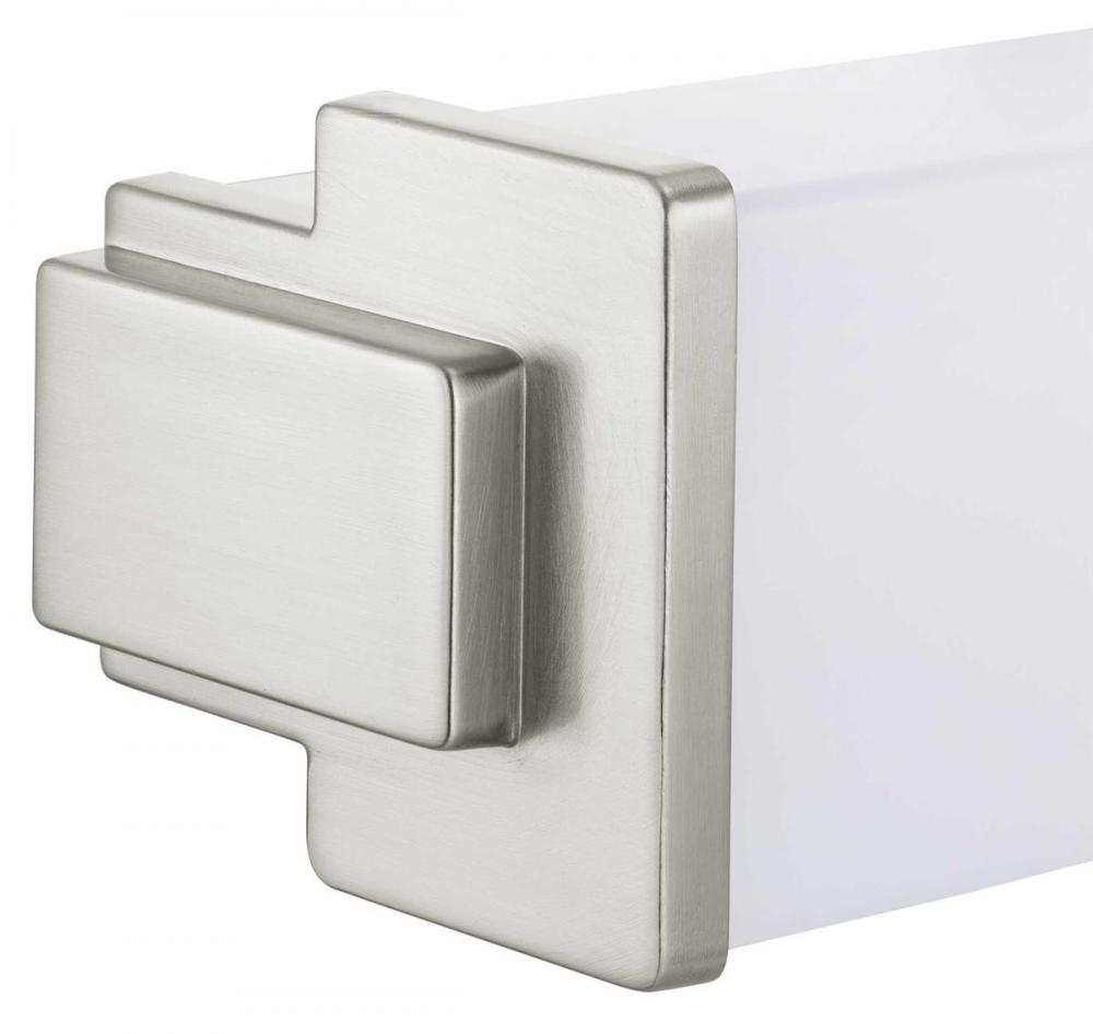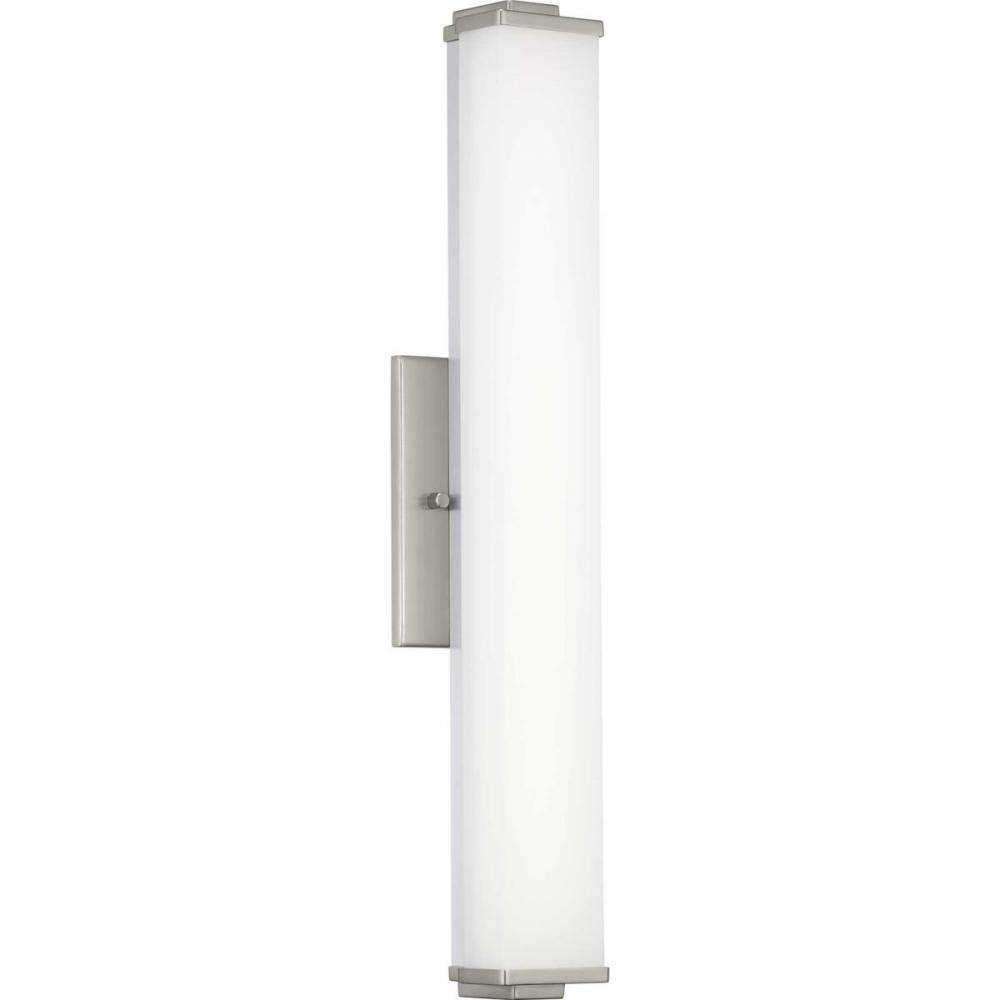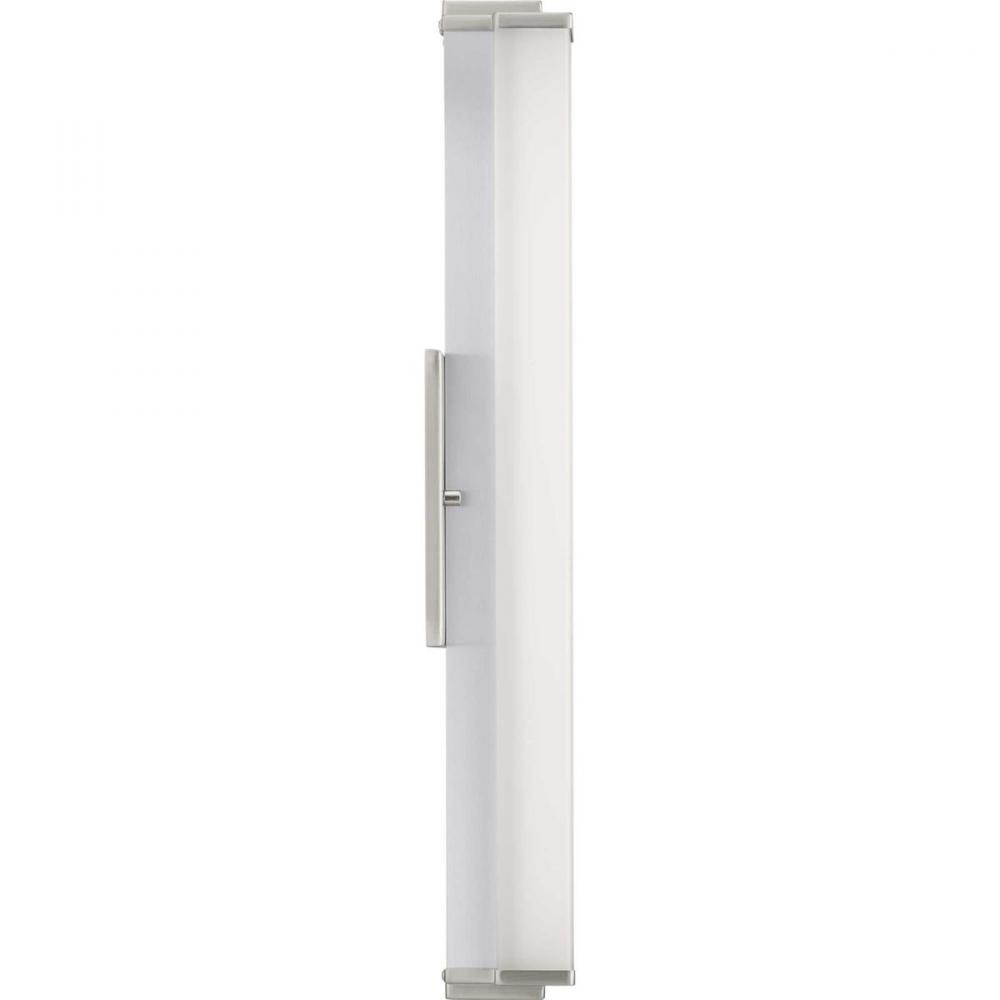 Ideal for a bathroom;Perfect for modern style settings;Beautiful brushed nickel finish;Crisp white acrylic shade;Fixture can mount horizontal and vertical;Includes 1 integrated LED (23 W), 1600 lumens, 3000 K, 90 CRI, dimmable;Measures 24-inch width by 4.
