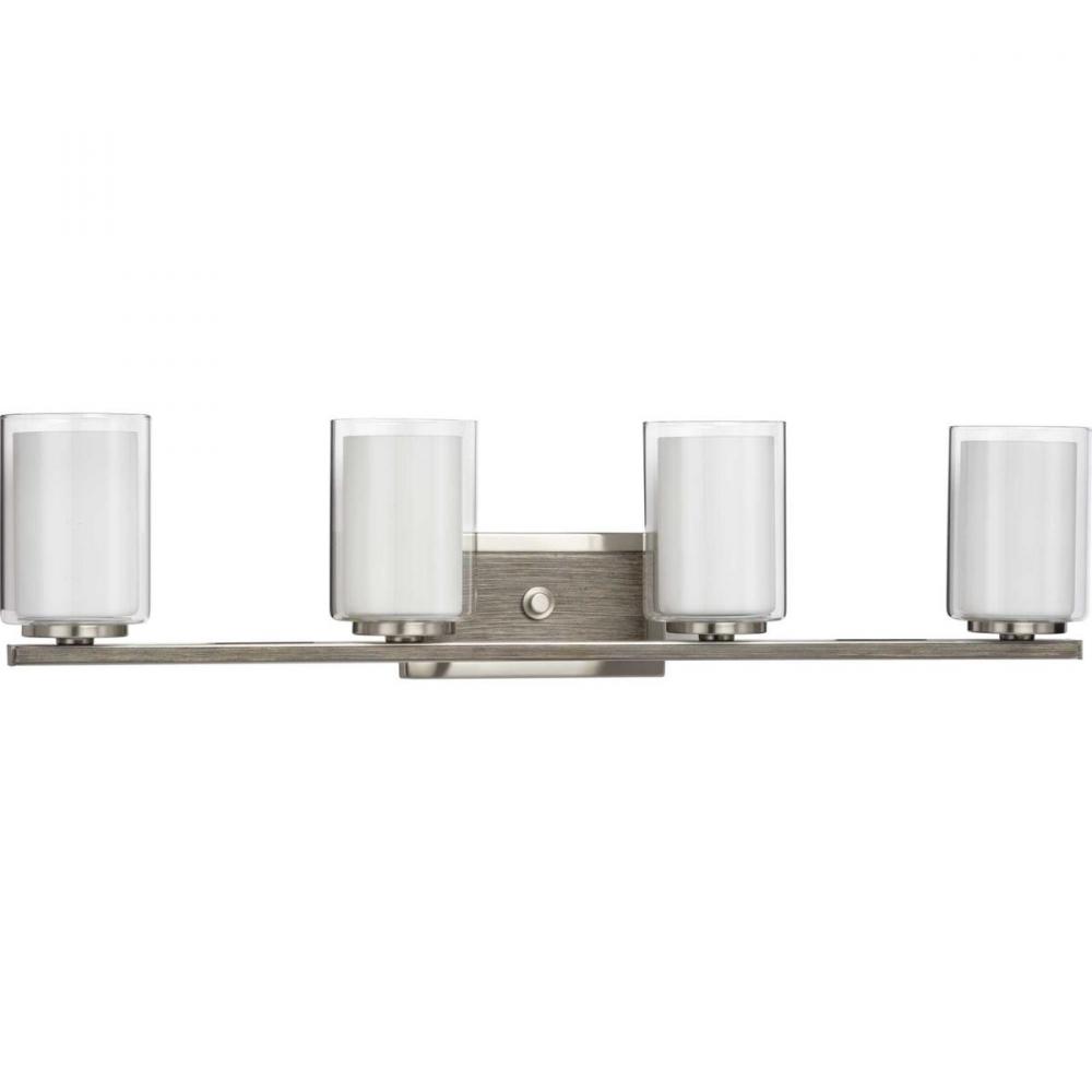 Create an environment of ease and relaxation in bath and vanity settings with the Mast four-light bath. A quartet of clear and etched glass shades create a votive candleholder appearance. A faux rectangular backplate paired with a straight bar, both accented by a Brushed Nickel finish, support the light fixtures in an airy, organic ensemble perfect for coastal and modern farmhouse settings.