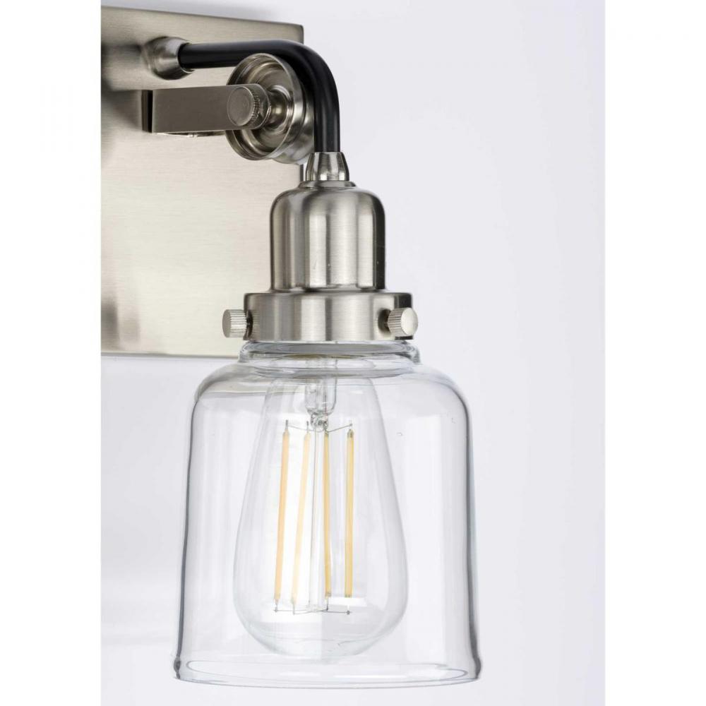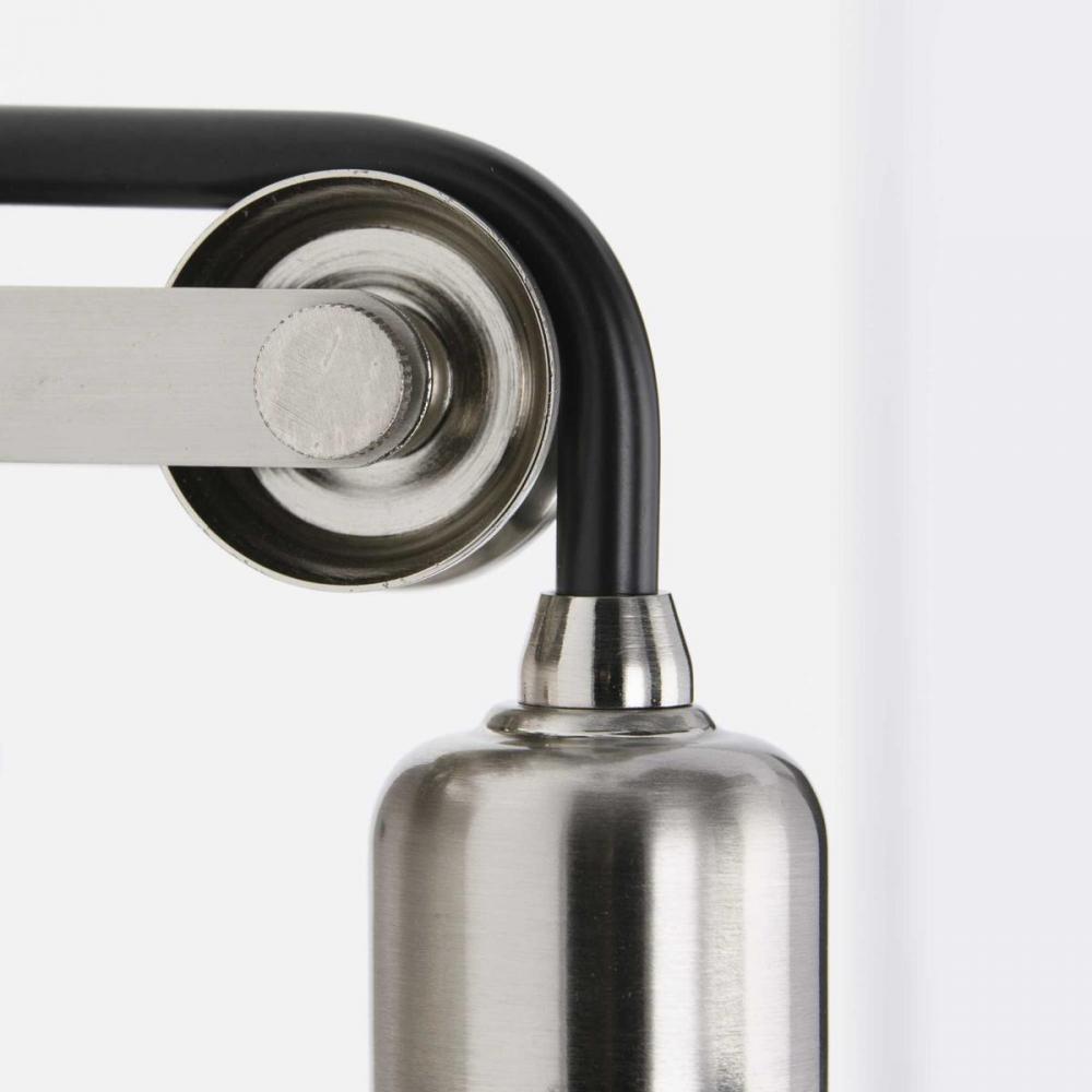 Feel the pains of design indecisiveness no more with the time-honored style of the Rushton four-light bath. An elegant quartet of exposed bulbs glow from within clear glass shades as they hang from antique-style sockets. Black tube arms stretch over mechanical pulley wheels to join the bulbs to the Brushed Nickel, rectangular backplate for a cohesive, history-inspired design ideal as a bath vanity or wall sconce in industrial and farmhouse settings.
