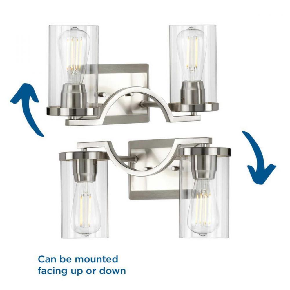 Manifest a swoon-worthy lighting experience with the stunning blend of modern and traditional styles in this one-of-a-kind light fixture. Square tubing with clean, sharp angles demand your attention and appreciation. A beautiful brushed nickel finish coats a handsome rectangular backplate. Striking vintage light sockets boast their bold yet simple demeanors within the safety of sophisticated clear glass shades.