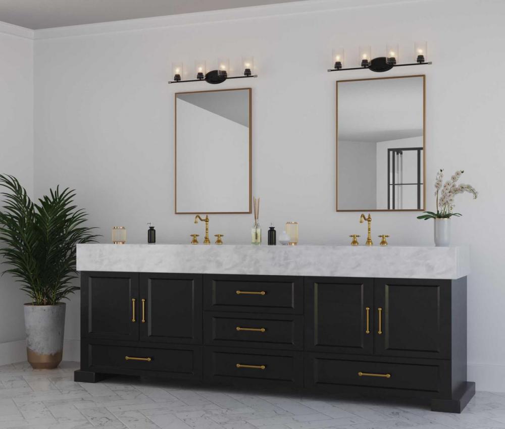 Incorporate a sleek simplicity and natural beauty with the Riley Collection's Four-Light Matte Black Bath. Clear glass shades offer rejuvenating illumination. The shades rest on a gorgeous matte black frame with brushed nickel finials for an overall design that exudes a feeling of tranquility and serenity. Ideal for any bathroom in new traditional or contemporary settings.