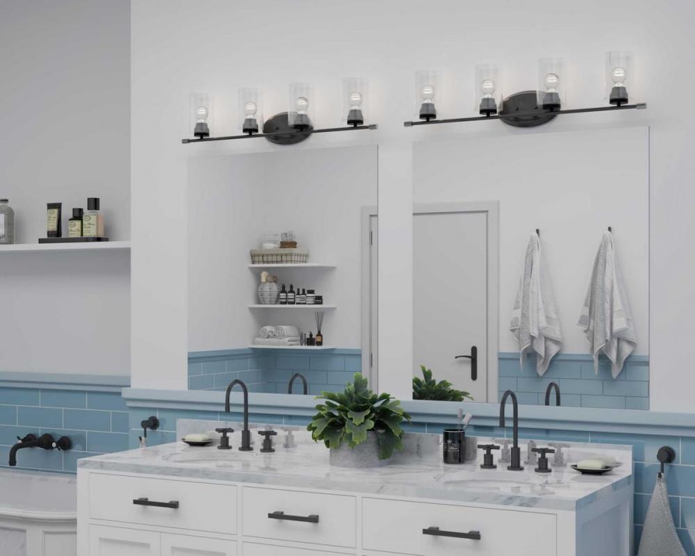 Incorporate A Sleek Simplicity And Natural Beauty With The Riley Collection'S Four-Light Matte Black Bath. Clear Glass Shades Offer Rejuvenating Illumination. The Shades Rest On A Gorgeous Matte Black Frame With Brushed Nickel Finials For An Overall Design That Exudes A Feeling Of Tranquility And Serenity. Ideal For Any Bathroom In New Traditional Or Contemporary Settings.
